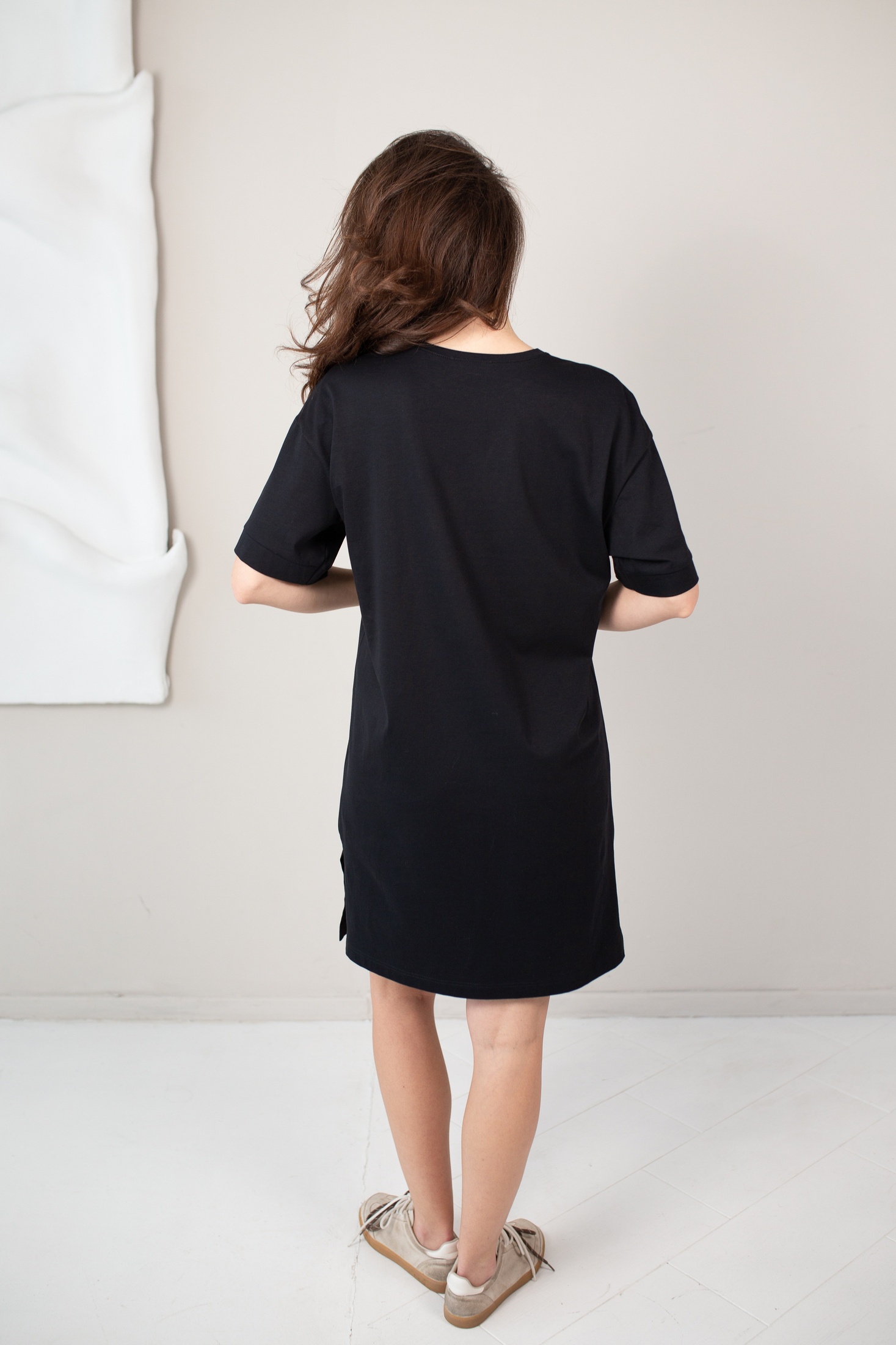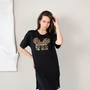 Черная туника свободного кроя изготовлена из легкого и приятного к телу материала. На груди выделяется стильный принт с изображением объемных золотистых очков и надписью "Never too old for dream", который добавляет образу индивидуальности и современного настроения. Модель выполнена с округлым вырезом и короткими рукавами, что обеспечивают комфорт и свободу движений. Универсальная длина делает эту тунику отличным выбором для повседневных образов.