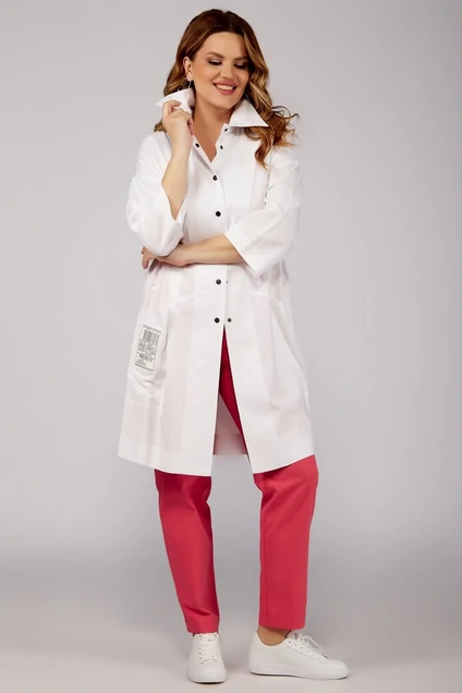 Туника свободного силуэта, с втачными рукавами, в боковых швах обработаны разрезы, с центральной сквозной застежкой на 6 кнопок и 1 кнопку на стойке воротника. Детали переда туники с наклонным подрезом на уровне линии бедер, в швах обработаны карманы (на правом кармане настрочена декоративная нашивка). Деталь спинки с горизонтальным подрезом на уровне линии бедер, верхняя часть со средним швом, вверху по центру настрочена декоративная нашивка. Рукава втачные одношовные, длиной ¾. Длина спинки – 92см.