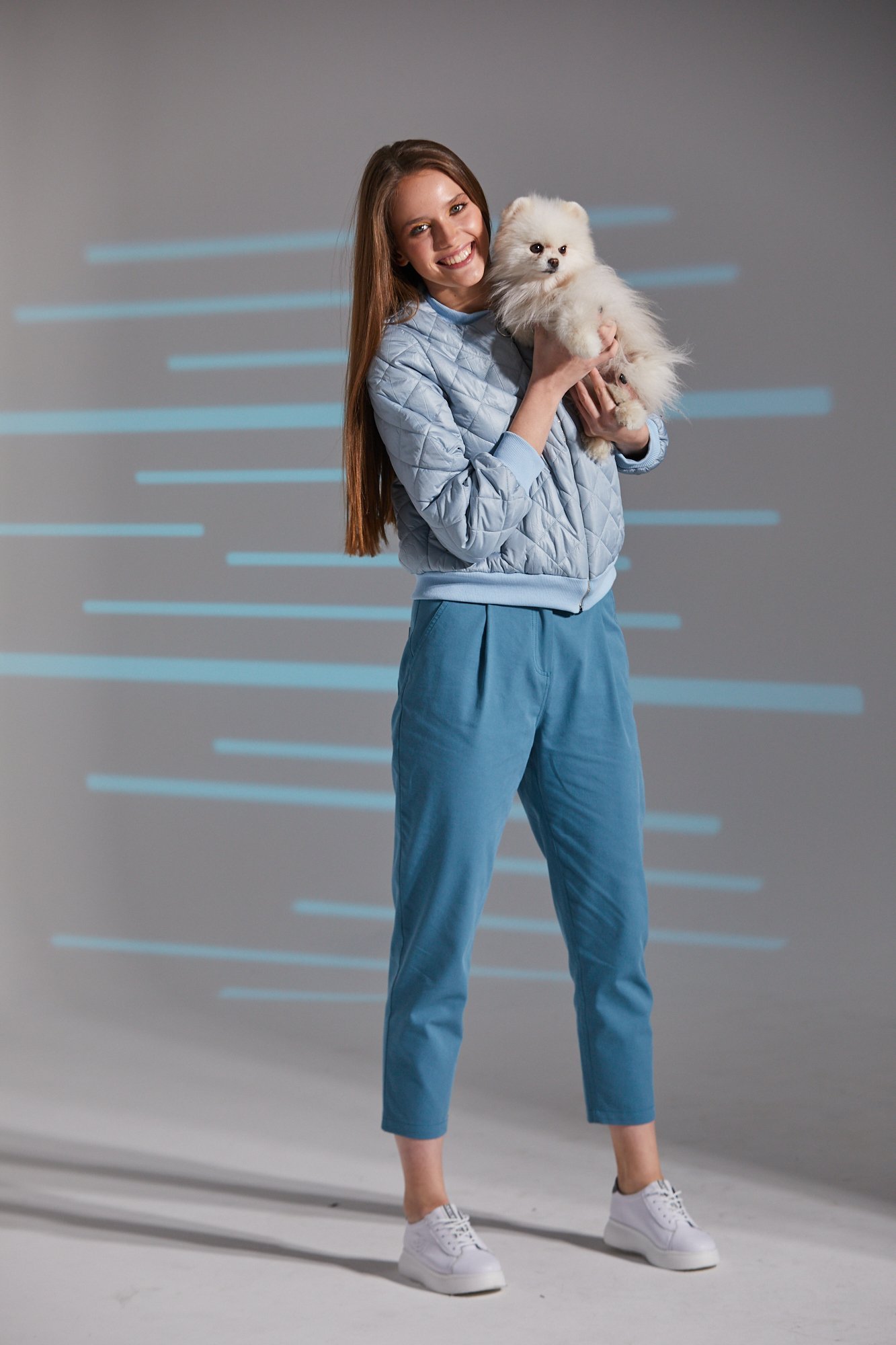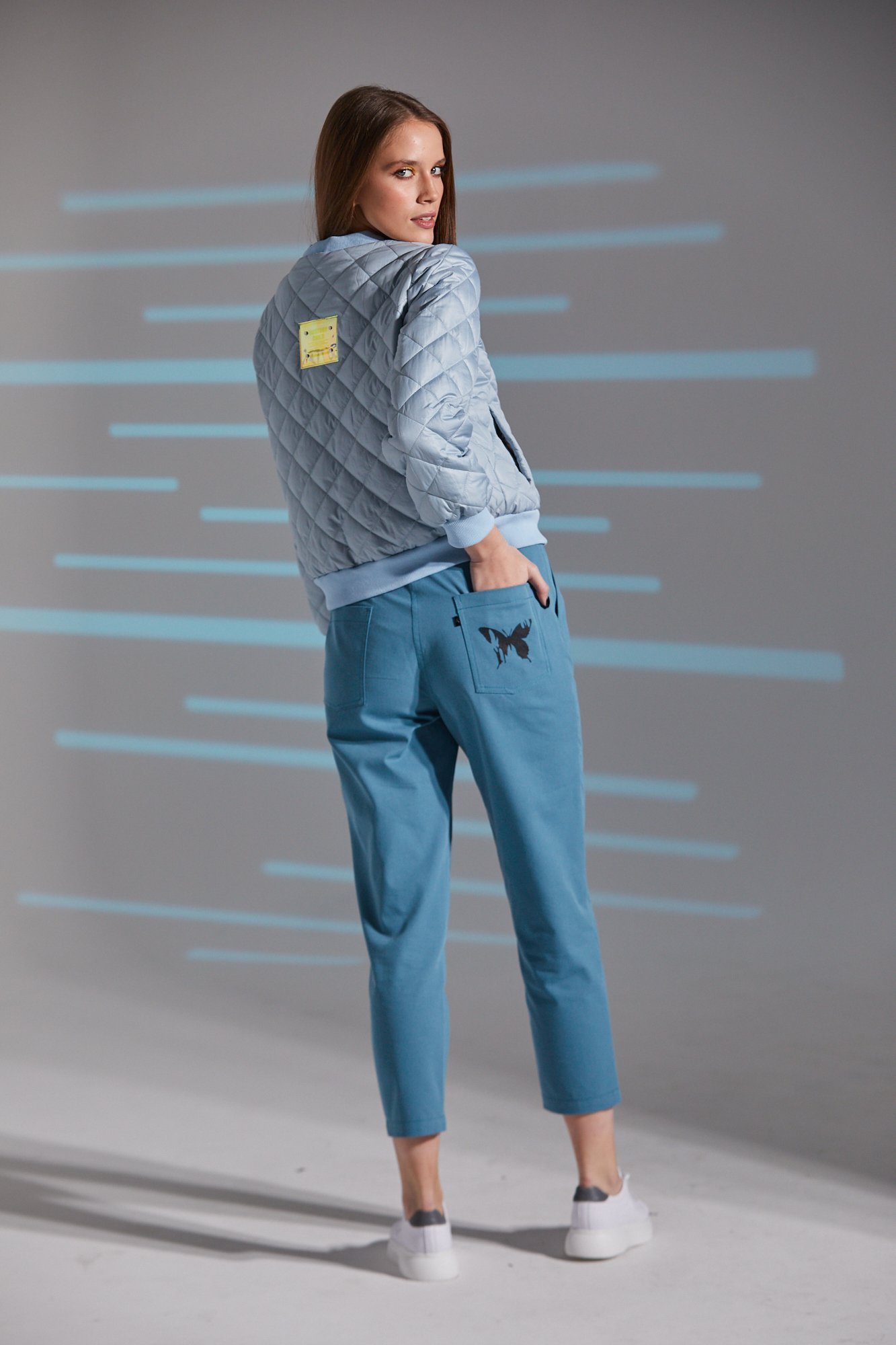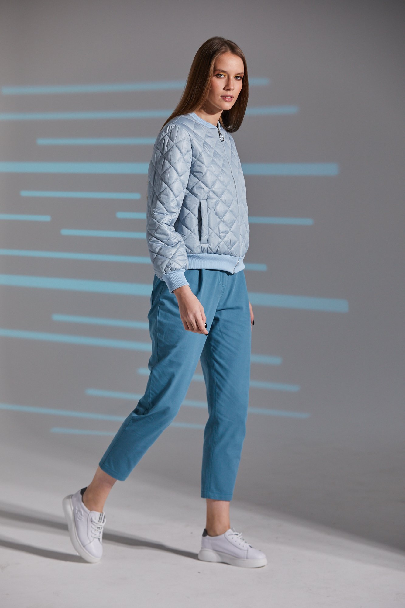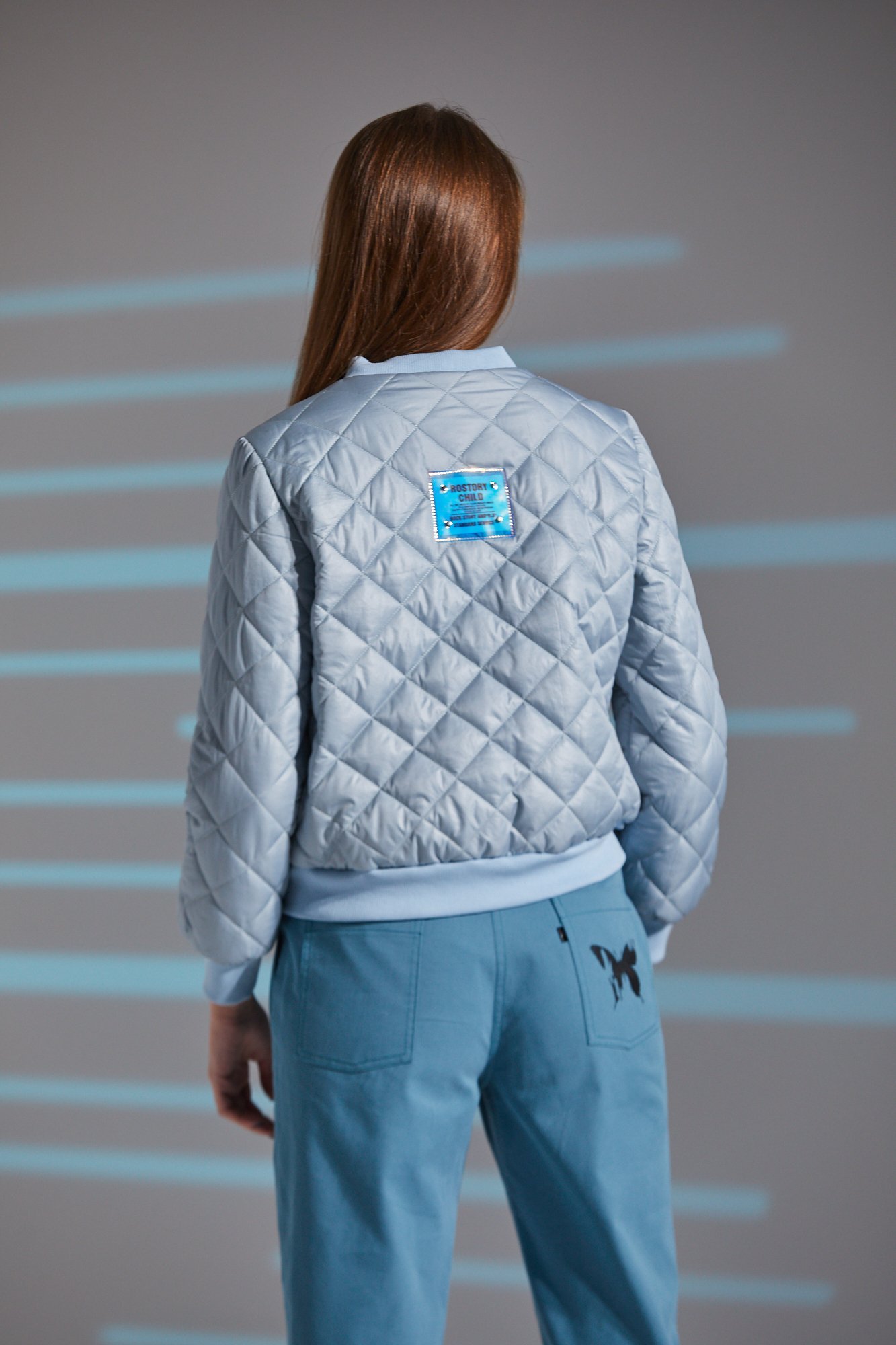 Бомбер из стёганой ткани прямого силуэта на подкладке. Рукав втачной, по низу - декоративный довяз. По переду карманы, застёжка на металлическую тесьму-молнию. Воротник прилегающий с довязом. На спине яркая нашивка. Длина рукава 60 см, длина изделия 56 см.