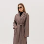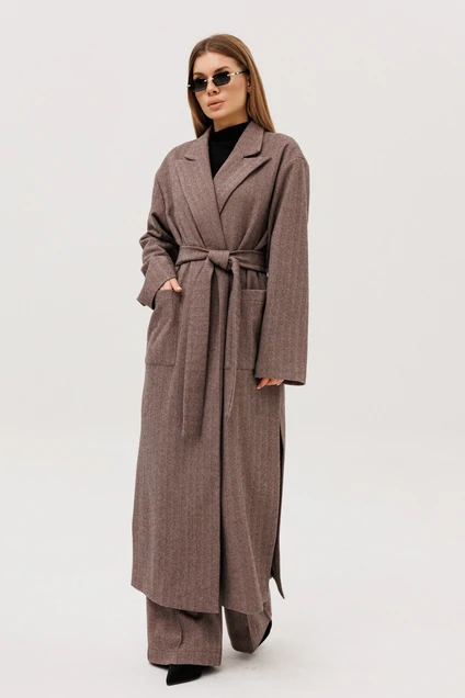Элегантный женский кардиган в теплых коричневых тонах выполнен из качественной теплой ткани, идеально подходящей для холодного времени года. Свободный силуэт, спущенное плечо и длинные рукава обеспечивают удобство и свободу движений, добавляя изделию стильный вид. Кардиган укомплектован удобными накладными карманами на передней части и прилегает подкладка для дополнительного комфорта. Боковые разрезы подчеркивают неформальный стиль, в то время как пояс из основной ткани позволяет акцентировать талию. Этот кардиган — идеальный выбор для создания современного и функционального образа.