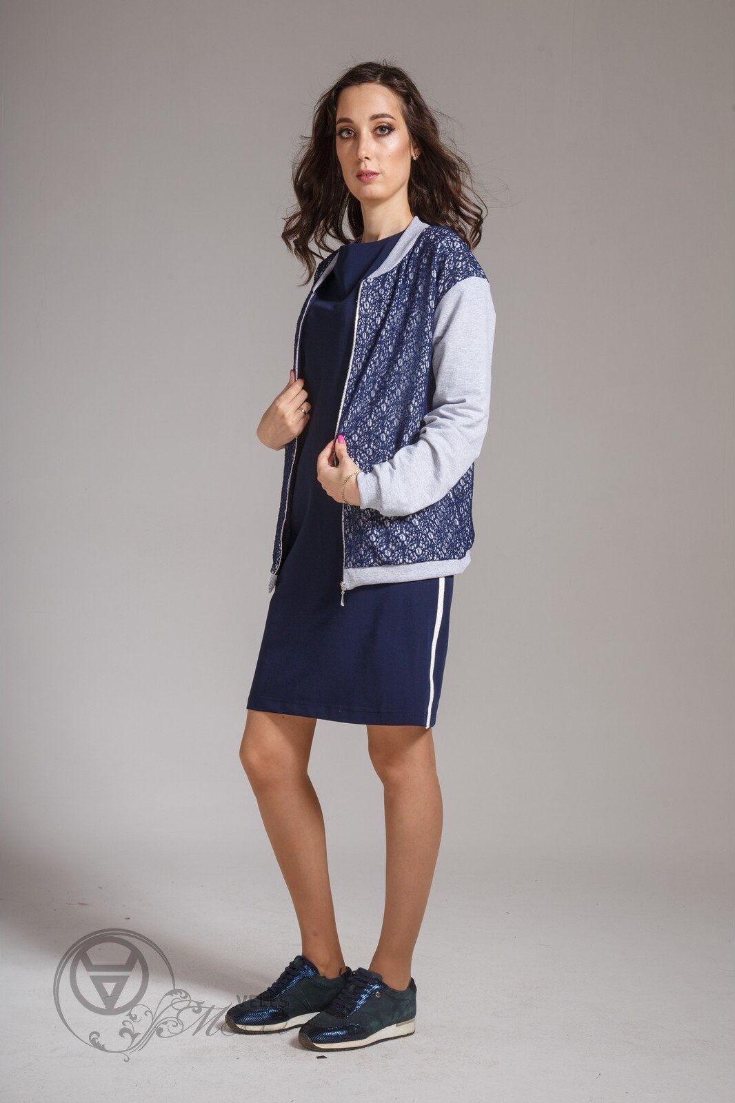 спортивный трикотажный с наложением кружева контрастного синего цвета по полочке и спинке. Без подкладки. Длина на рост 164-57, 170-63. Длина рукава от горловины на рост 164-68, 170-73.