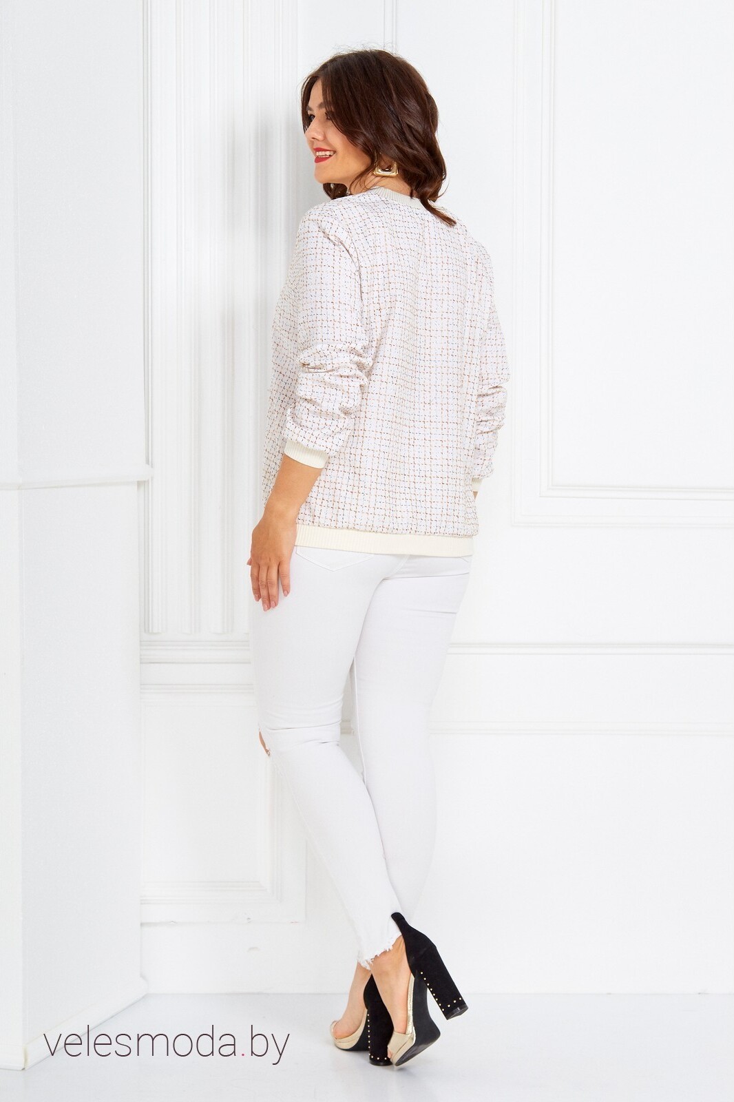 Бомбер женский из текстильной ткани: на молочной основе квадраты. Рукав длинный , одношовный, втачной. В горловину овальной формы вставлен воротник из довяза. По низу бомбера и низу рукава довяз. По переду застежка молнию. Длина бомбера (с поясом): (50-54)-62 . Длина рукава (с манжетой): (50-54)-61см., (56-60)-62см.