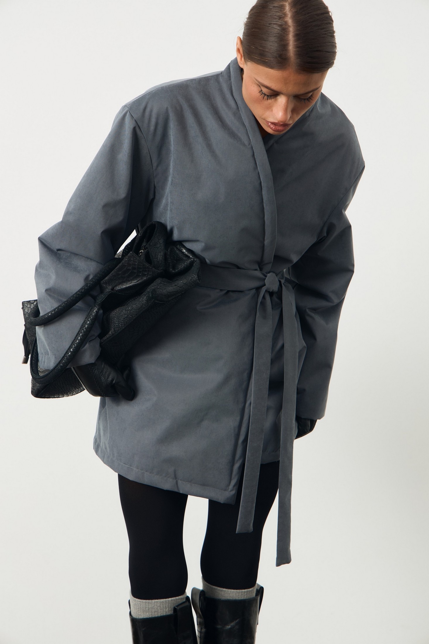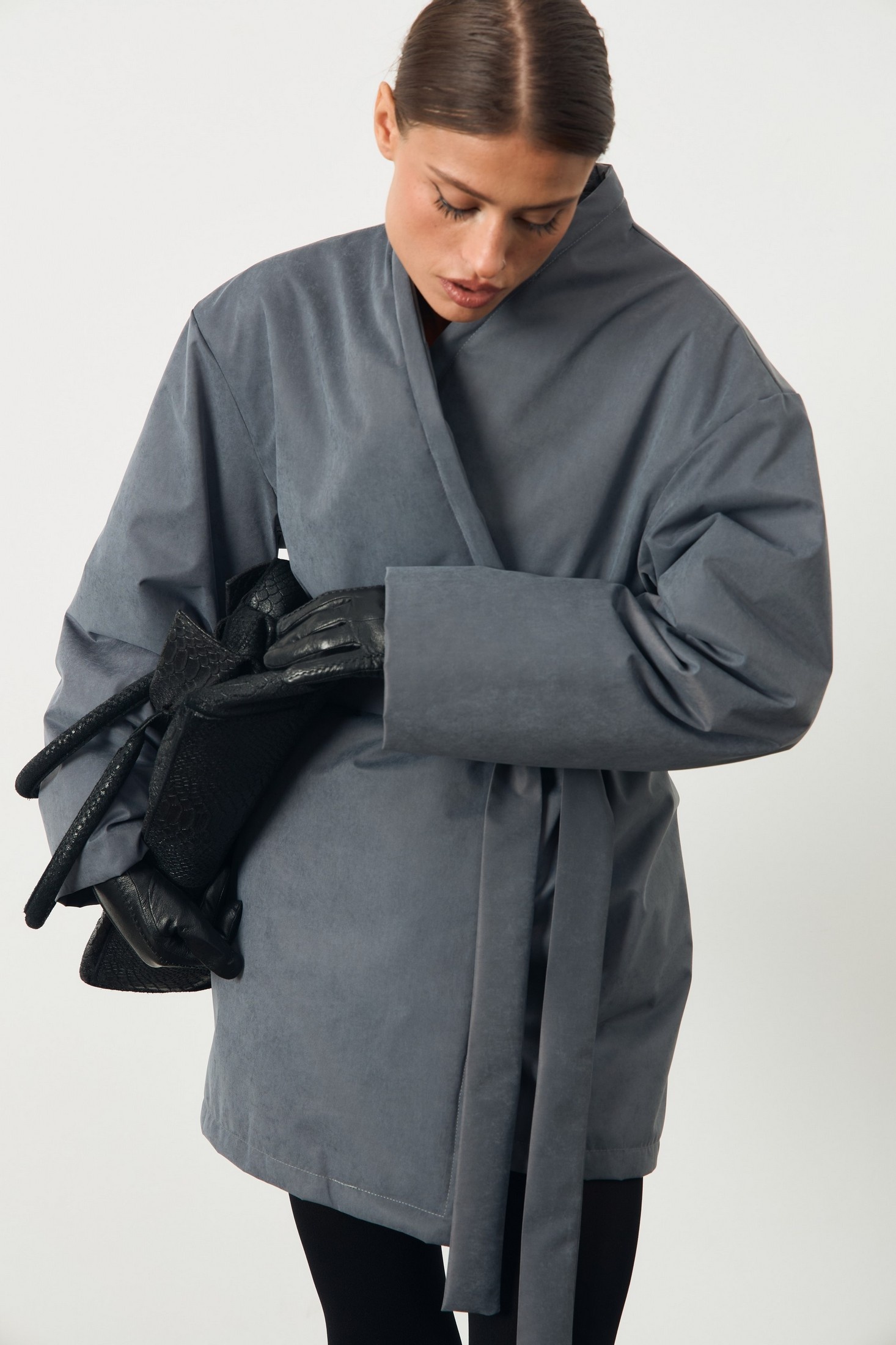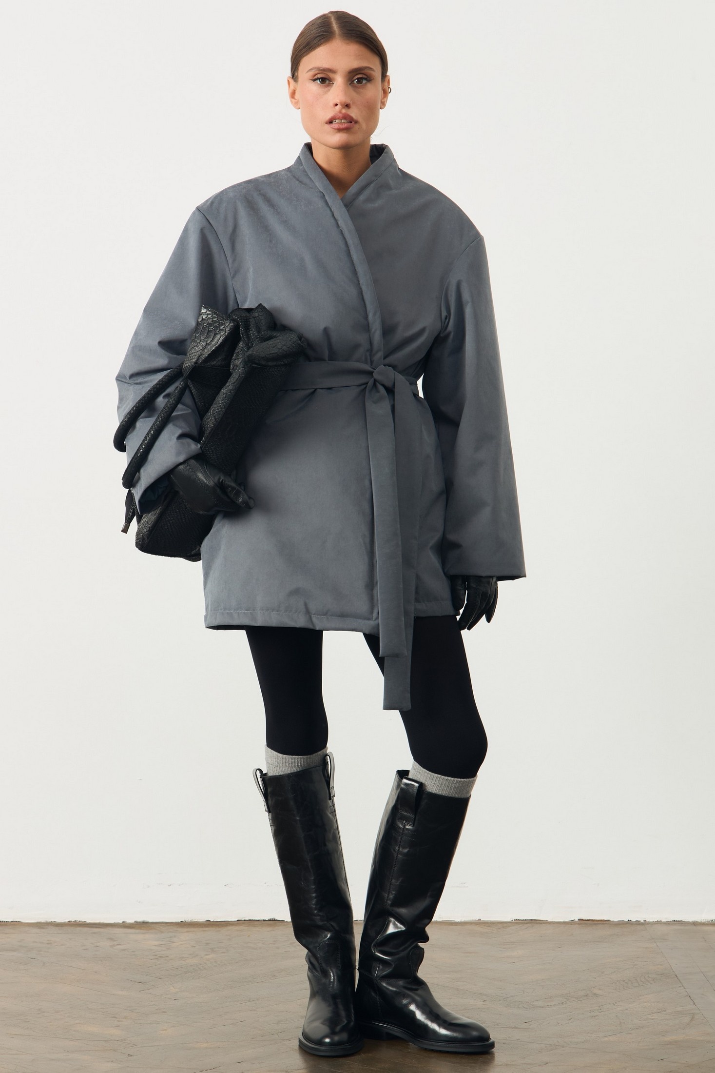 Куртка-кимоно из водостойкой плащёвой ткани. В боковых швах карманы. По краю борта отстрочки.Модель с поясом.