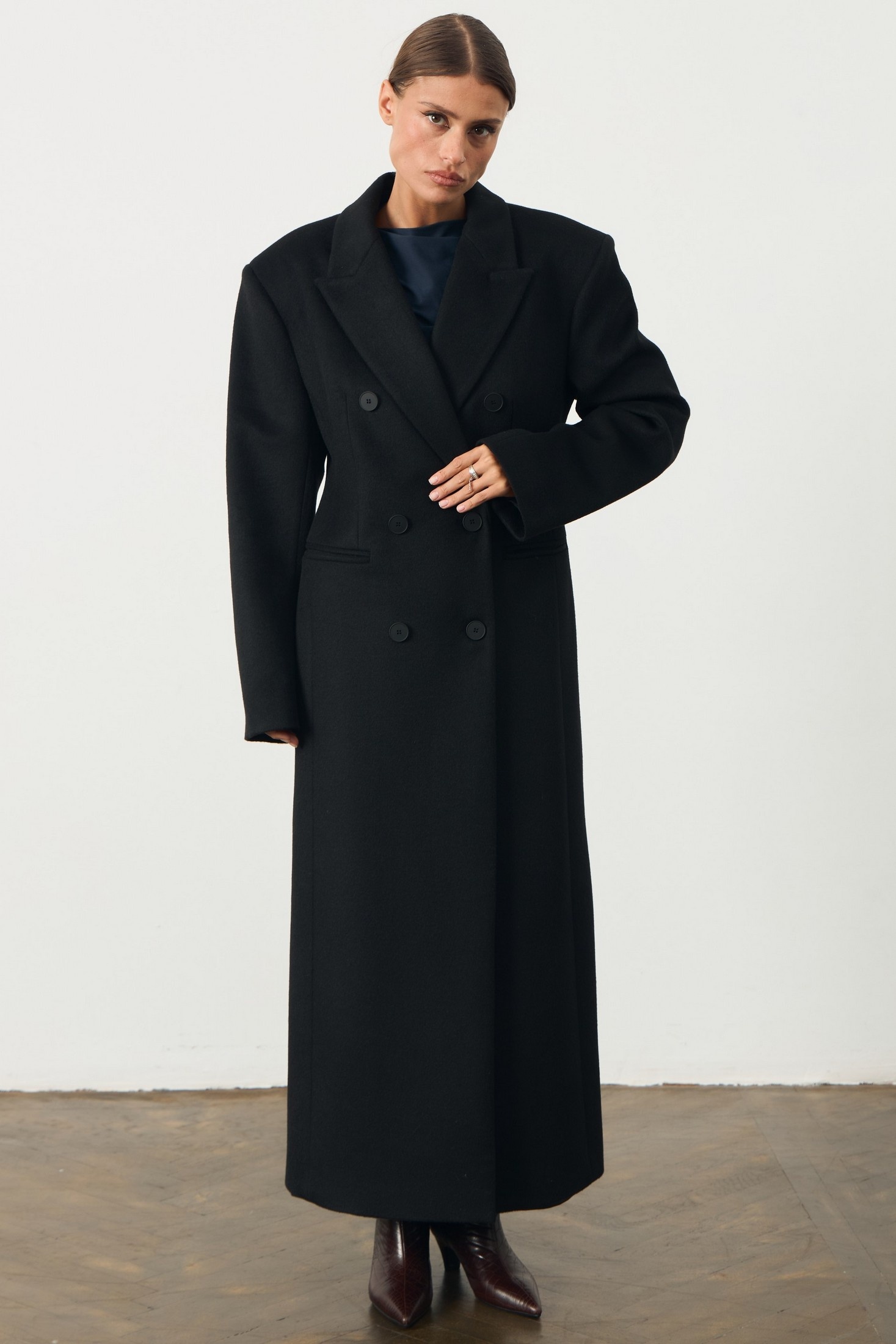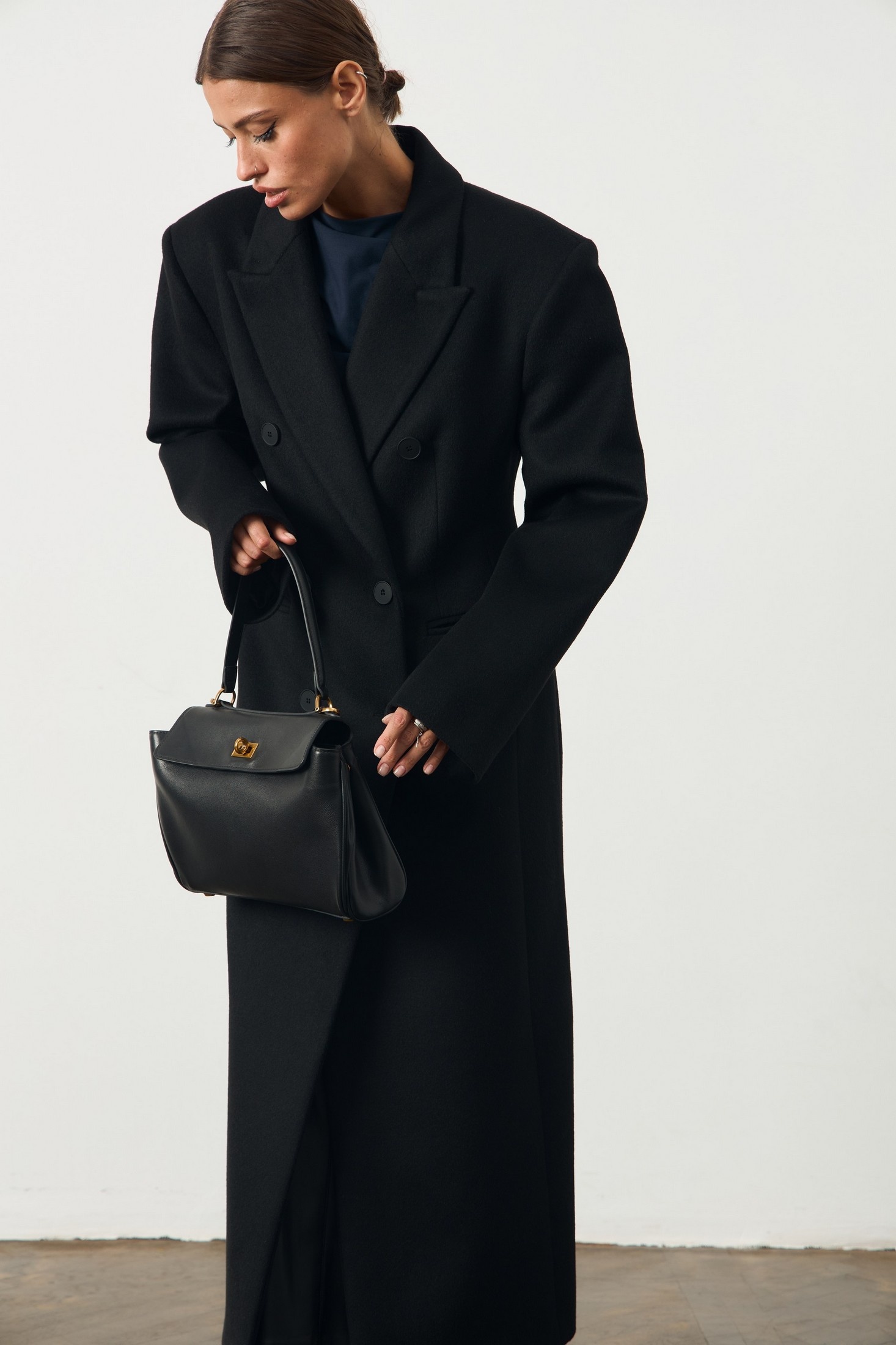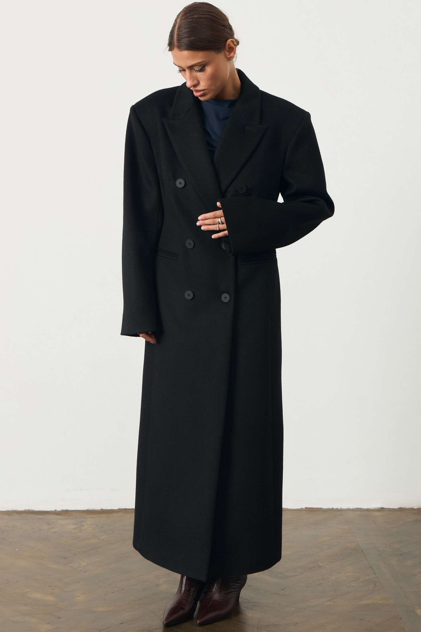 Элегантное длинное пальто черного цвета, выполнено из высококачественной шерстяной ткани. Модель обладает полуприлегающим силуэтом, что обеспечивает изящный и современный вид. Пальто имеет двубортную застежку на пуговицы, воротник с заостренными лацканами дополняет стильное исполнение модели. Практичные карманы с листочками по переду не только удобны, но и добавляют изделию оригинальности. Это пальто станет идеальным выбором для женщины, ценящей комфорт и элегантность в городской среде.