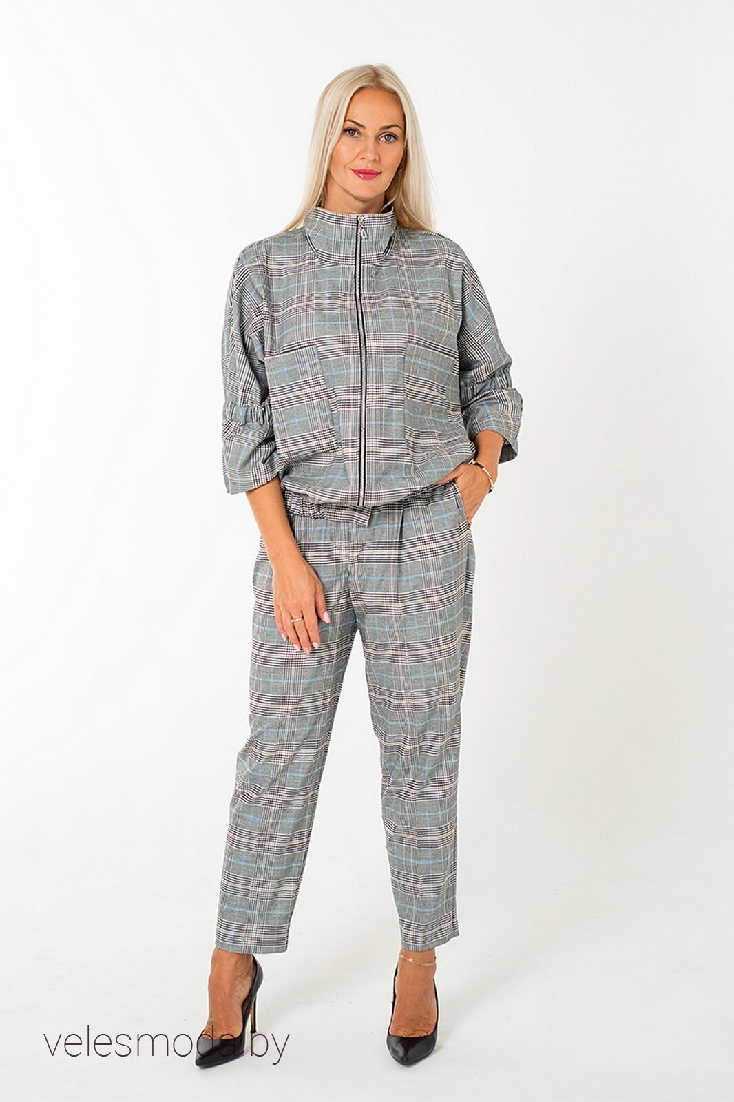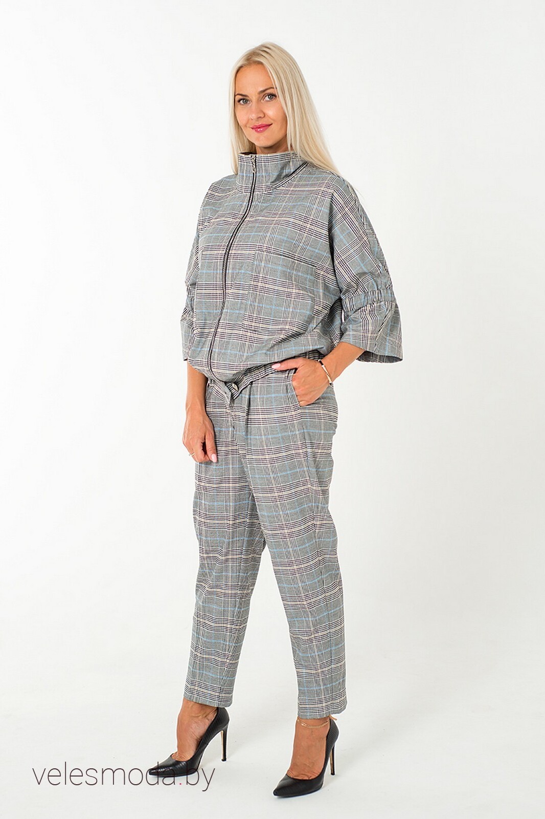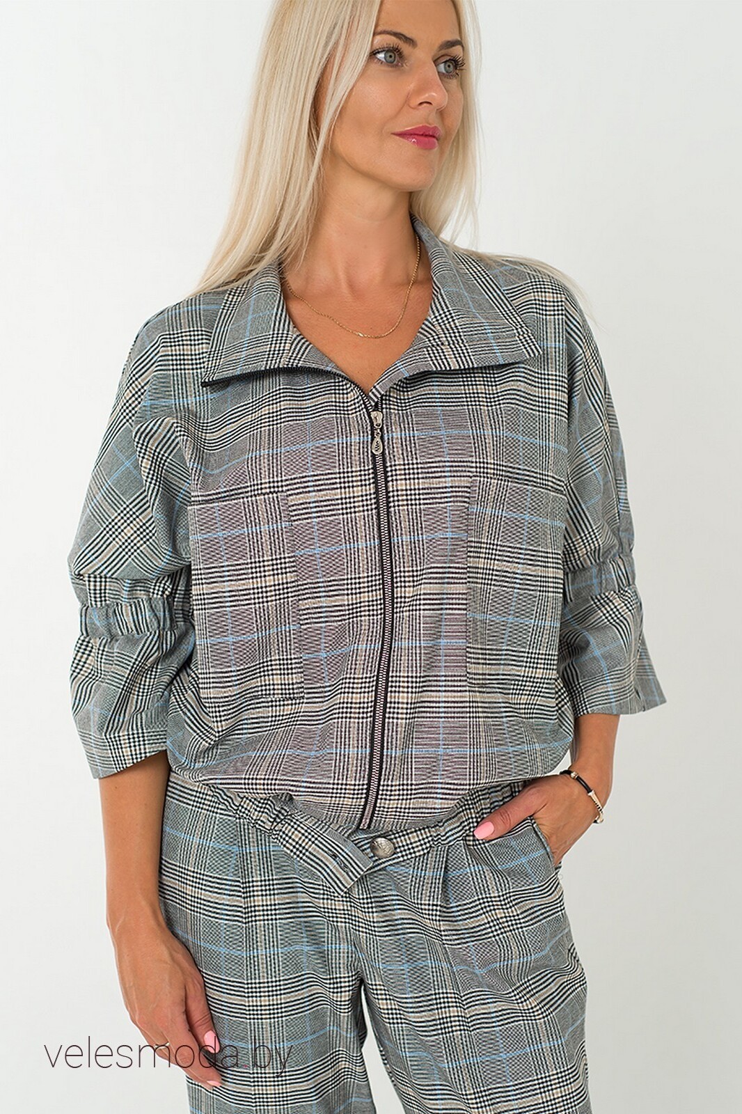 Клетчатая куртка-бомбер на молнии, с резинкой по низу. Рукава в форме колокольчика длиной 3/4. На передней части куртки имеются накладные карманы.