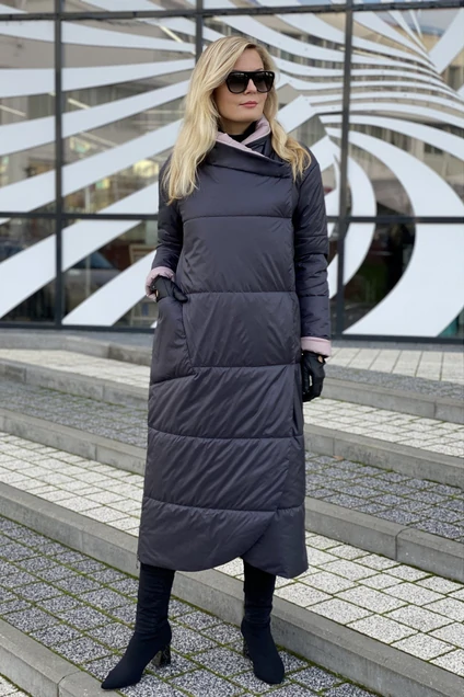 Пальто женское из плащевой ткани со съемным поясом, на утеплителе нового поколения "изософт". Пальто прямого покроя, двубортное, удлиненное, с закругленным снизу краем борта, воротник-стойка, с втачным рукавом на спущенной пройме, с накладным карманом. Изделие застегивается на кнопки, по низу в боковых швах молнии, пальто на подкладке. Рекомендуется носить при температуре -10 и до -20 градусов.