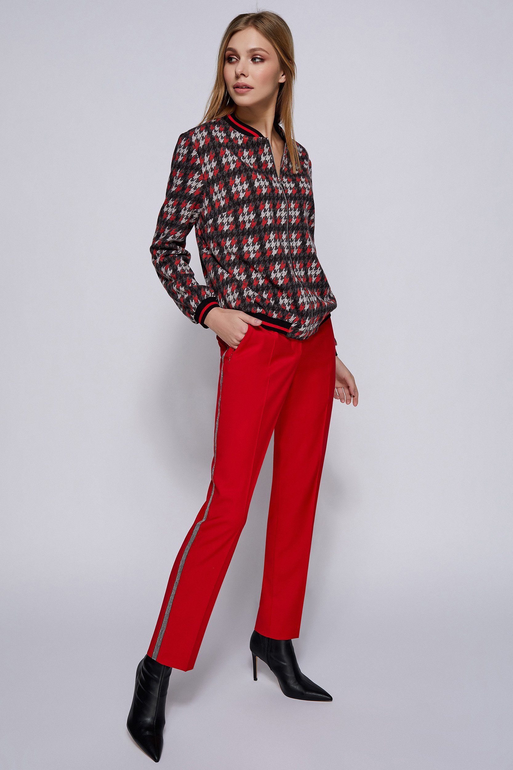 - бомбер прямого силуэта с застёжкой на молнию и отделочнойтрикотажной тесьмой по горловине, низу рукавов и низу изделия