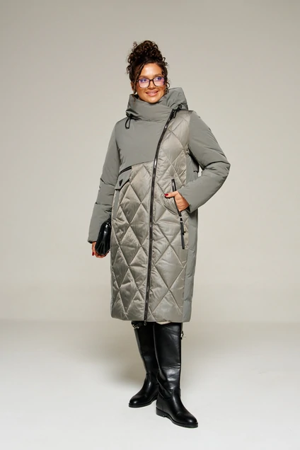 Перед асимметричный. С правой стороны расположены кокетка и вертикальный подрез от неё. В кокетку вставлена декоративная молния и клапан с пришивным отделочным элементом. На центральной правой части переда расположен боковой прорезной карман с обтачкой. С левой стороны – два вертикальных рельефа: от плеча (в который вставлена часть молнии) и от проймы, а также боковой прорезной карман на молнии с декоративным фиксатором. Центральные части переда выполнены из отделочной стеганой ткани с блеском аналогичного оттенка с цветом изделия.