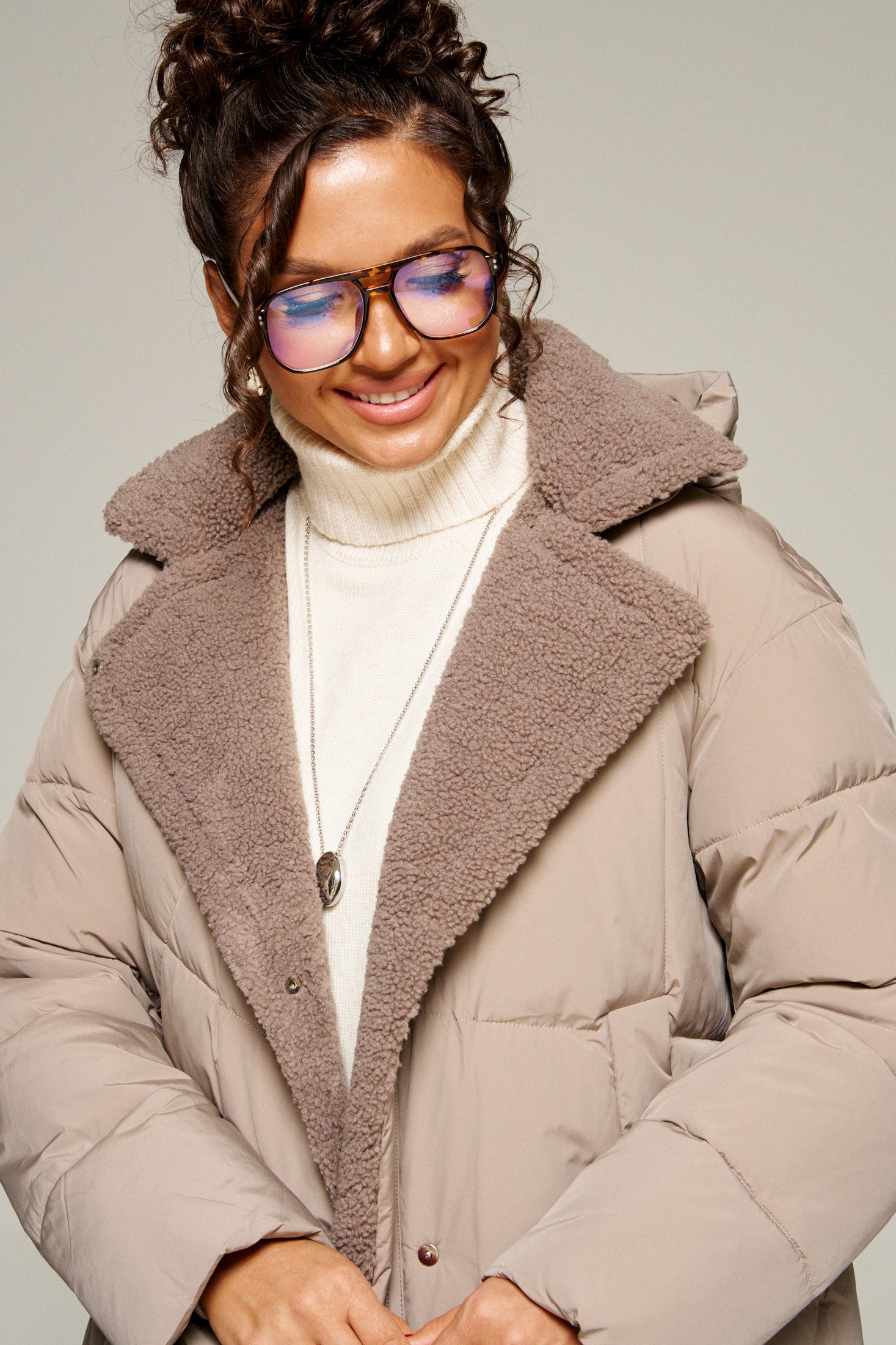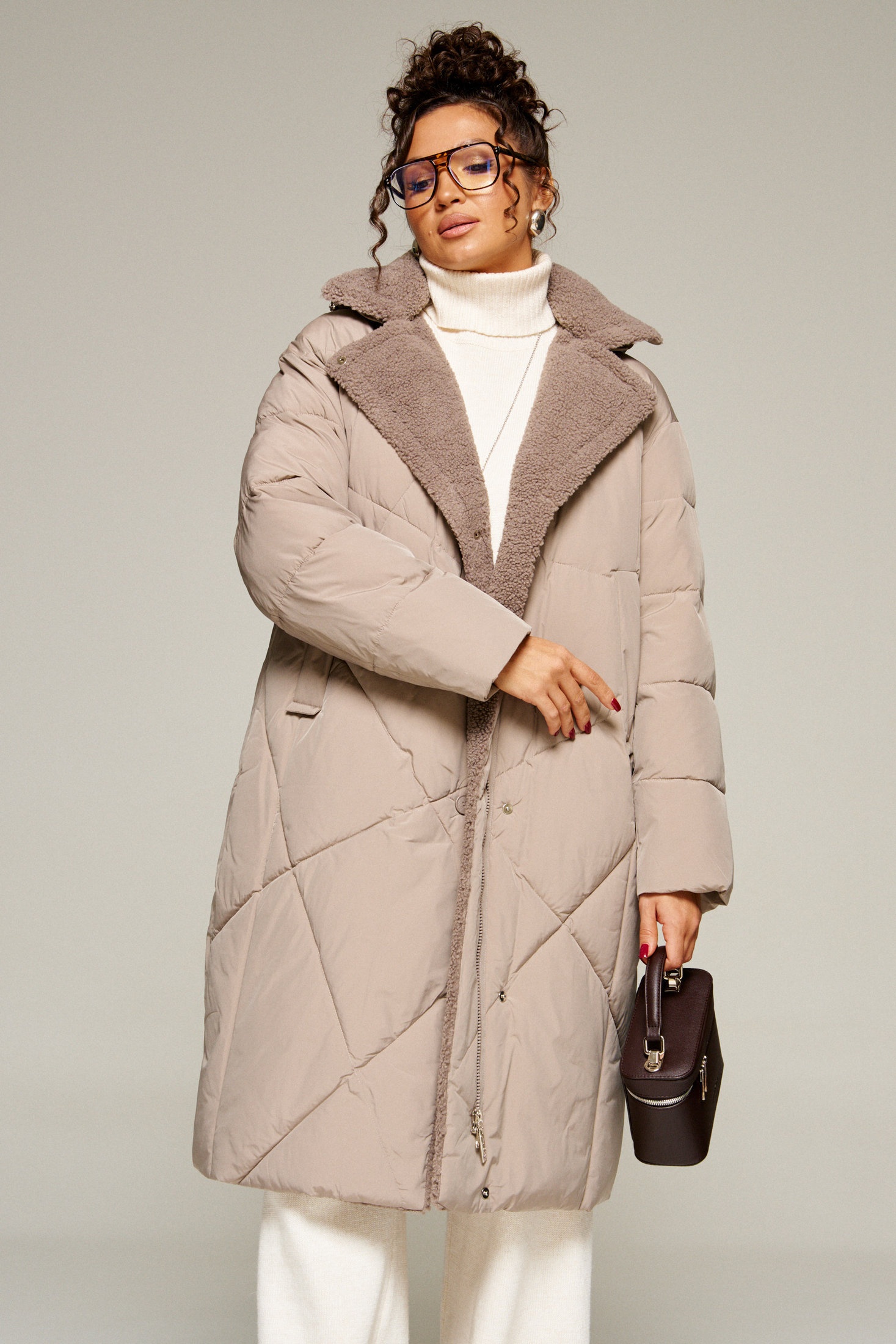 Воротник пиджачного типа с возможностью застегивания до верха. Внутренняя часть воротника, борта и лацканы обработаны искусственным мехом «овчина».