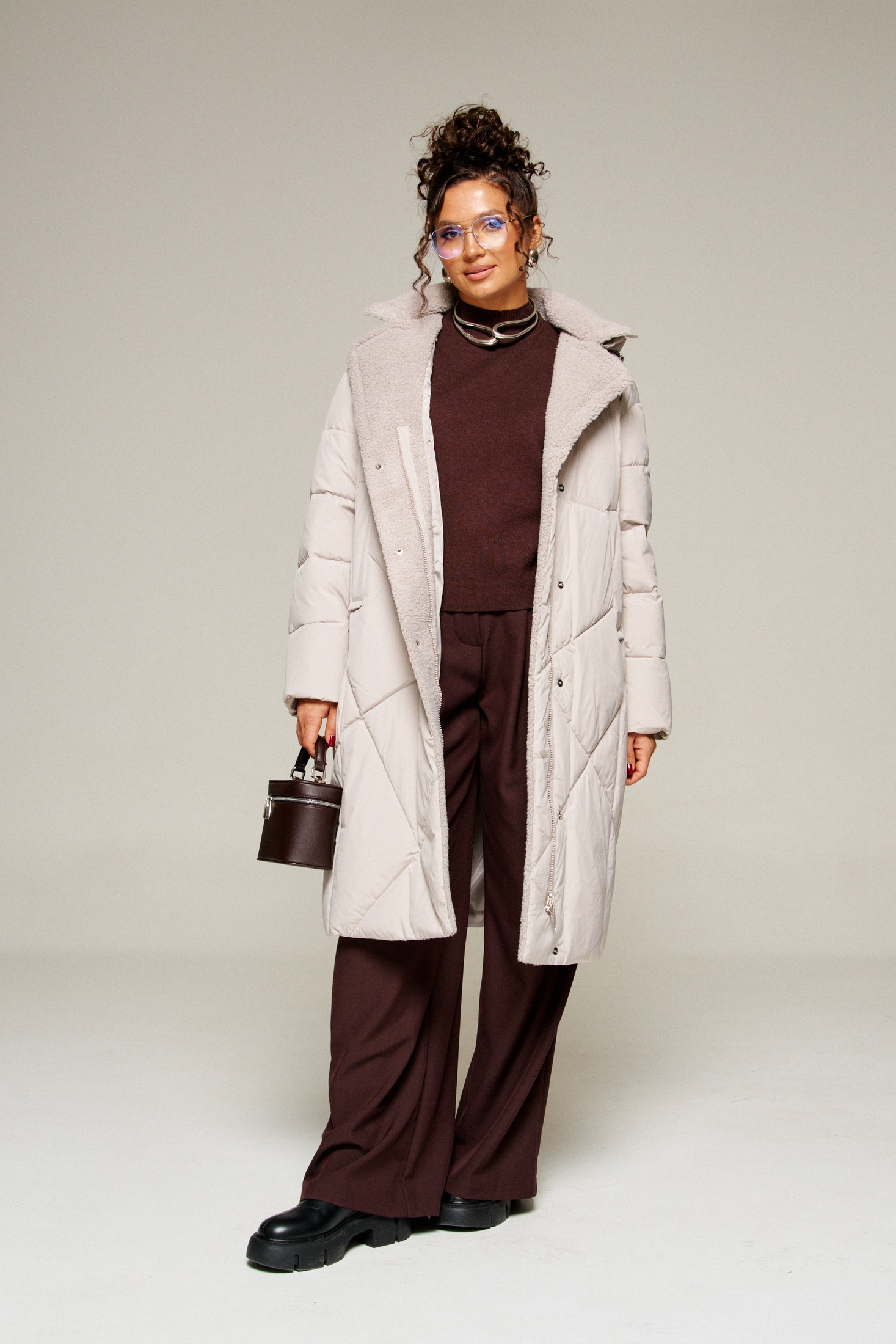 Воротник пиджачного типа с возможностью застегивания до верха. Внутренняя часть воротника, борта и лацканы обработаны искусственным мехом «овчина».