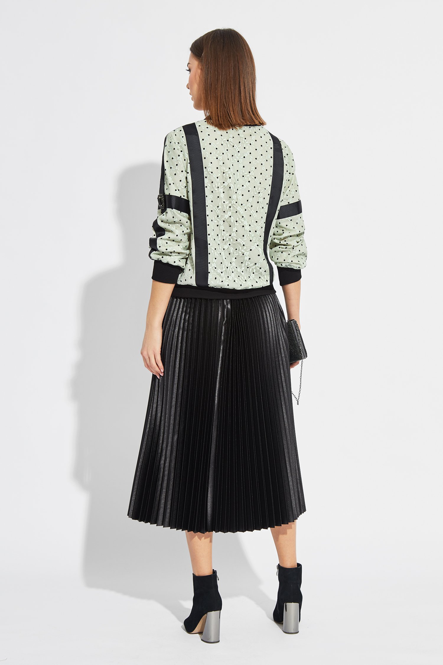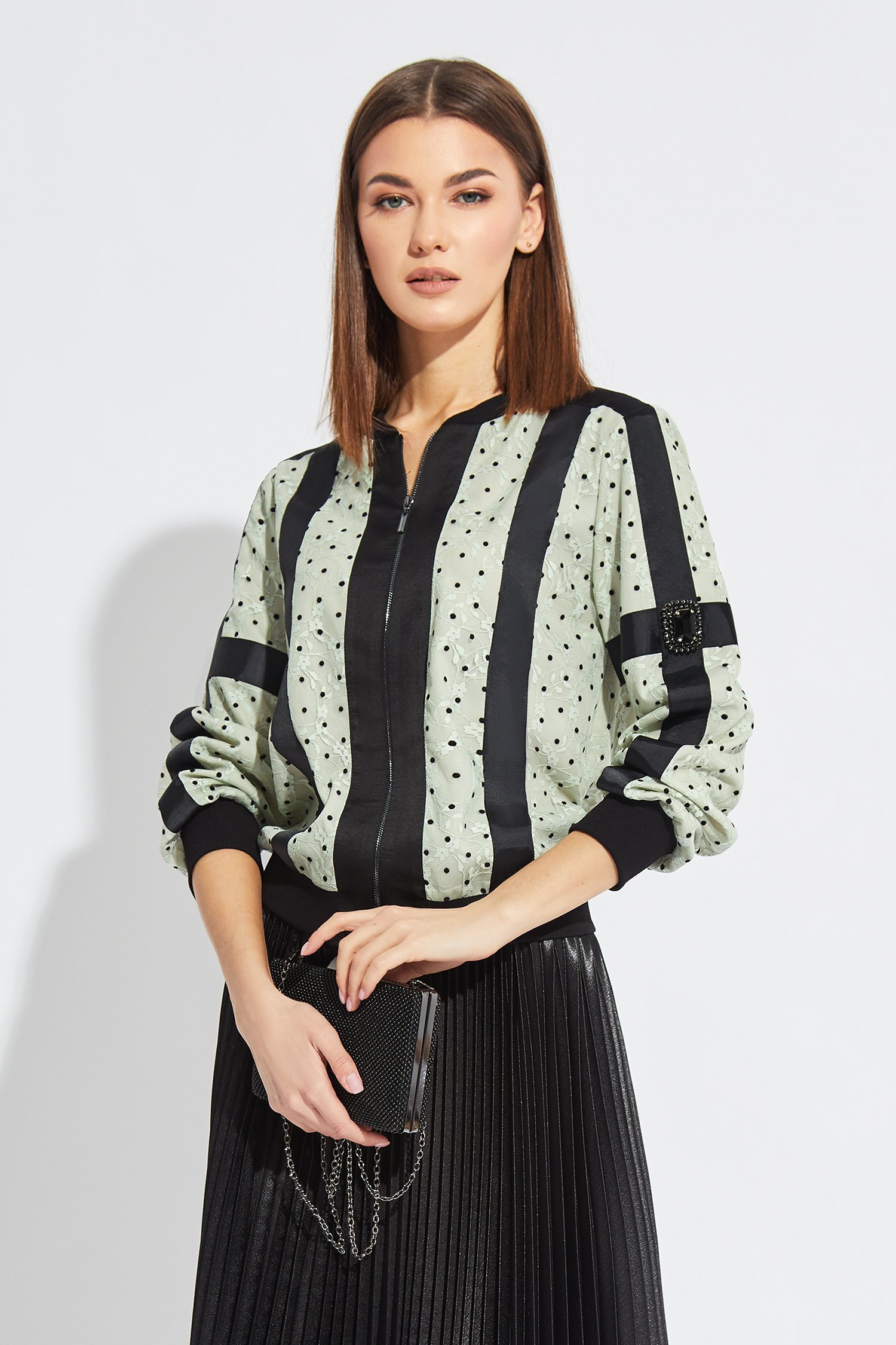 Бомбер прямого силуэта, внизу на манжете, с втачным рукавом на манжете. С застежкой на металлическую тесьму-молнию. Воротник прилегающий-довяз. Бомбер с настрочными широкими репсовыми лентами по полочке, спинке и рукаву. Правый рукав с отделочным пришивным украшением.
