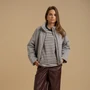 Жакет свободного покроя из трикотажного полотна серого цвета с водоотталкивающей пропиткой. Элегантный воротник-стойка и длинные втачные рукава создают комфортный и практичный образ. Модель оснащена декоративной молнией в качестве застежки и дополнена утеплетелем из синтепона. Для удобства хранения предметов предусмотрены прорезные карманы с молнией на передних половинках. Всё изделие посажено на подкладку для дополнительного комфорта.