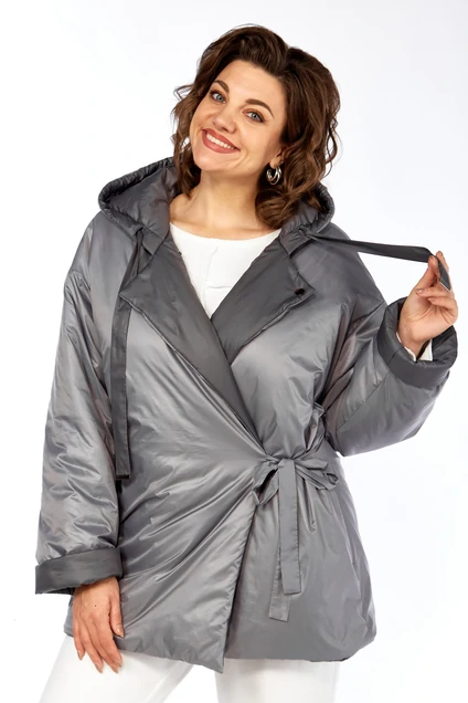 Куртка женская двухсторонняя с центральной бортовой застежкой на кнопки. Спинка простая. Перед с боковыми карманами с одной стороны "с листочкой", а внутренняя сторона с карманами в боковых швах. Рукав втачной одношовный со спущенной линией плеча. Воротник-капюшон с кулисой. Есть пояс на резинке с застежкой на пряжку. Куртка утепленная. Температурный режим до - 10 градусов. Фурнитура может отличаться от заявленной на фото. Длина по спинке 80 см, длина рукава 55 см.