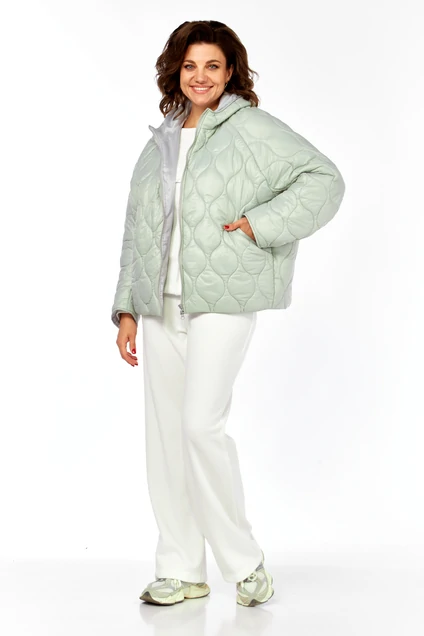 Куртка женская, О-образного силуэта с центральной застежкой на молнию. Спинка простая. Перед с боковыми карманами "с листочкой". Рукав-реглан . Воротник-капюшон. По низу куртки в подкладке обработана кулиса со шнуром и регулятором. Куртка на утеплителе. Температурный режим до -5 градусов. Длина по спинке 69 см, длина рукава+ширина плеча 77 см.