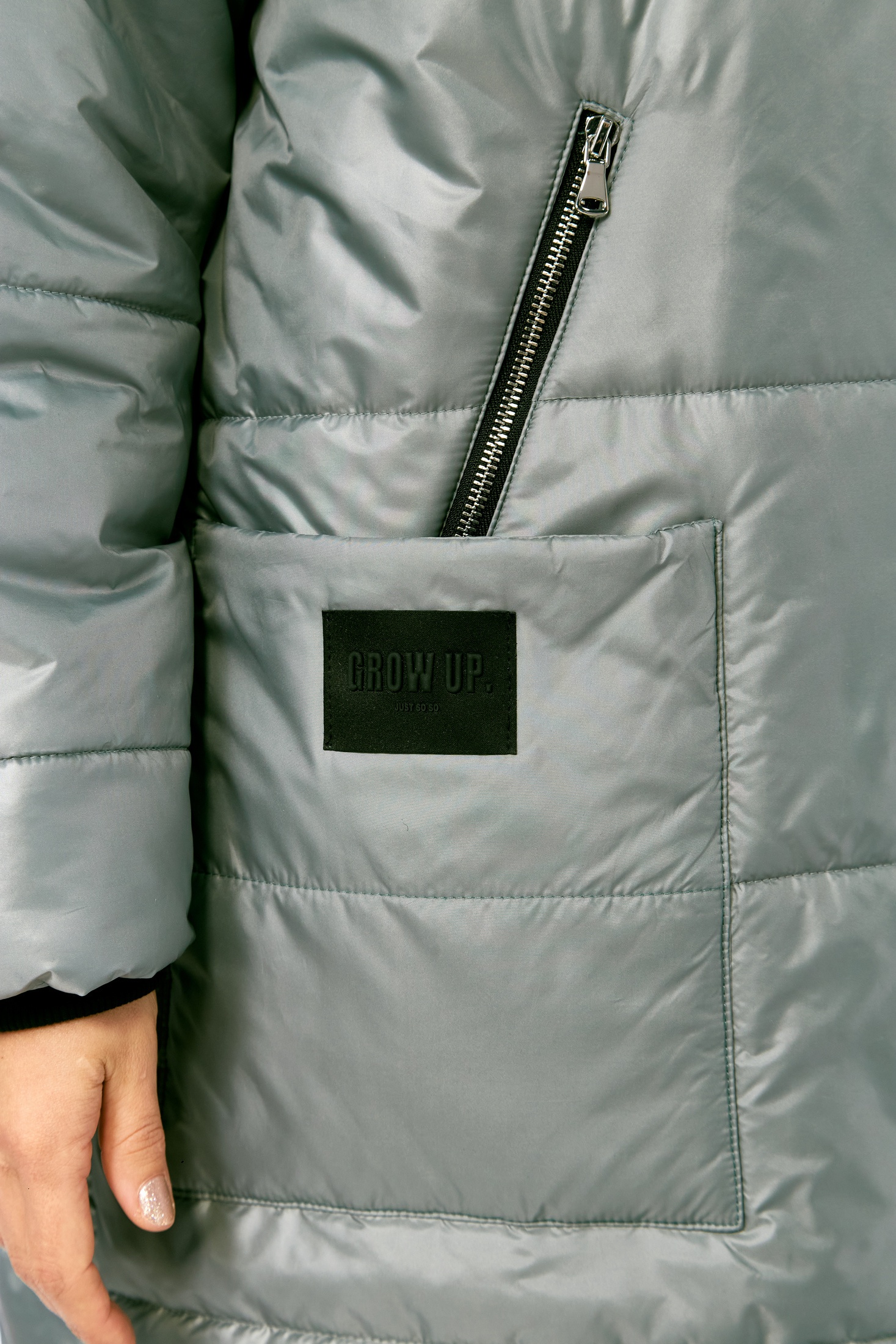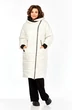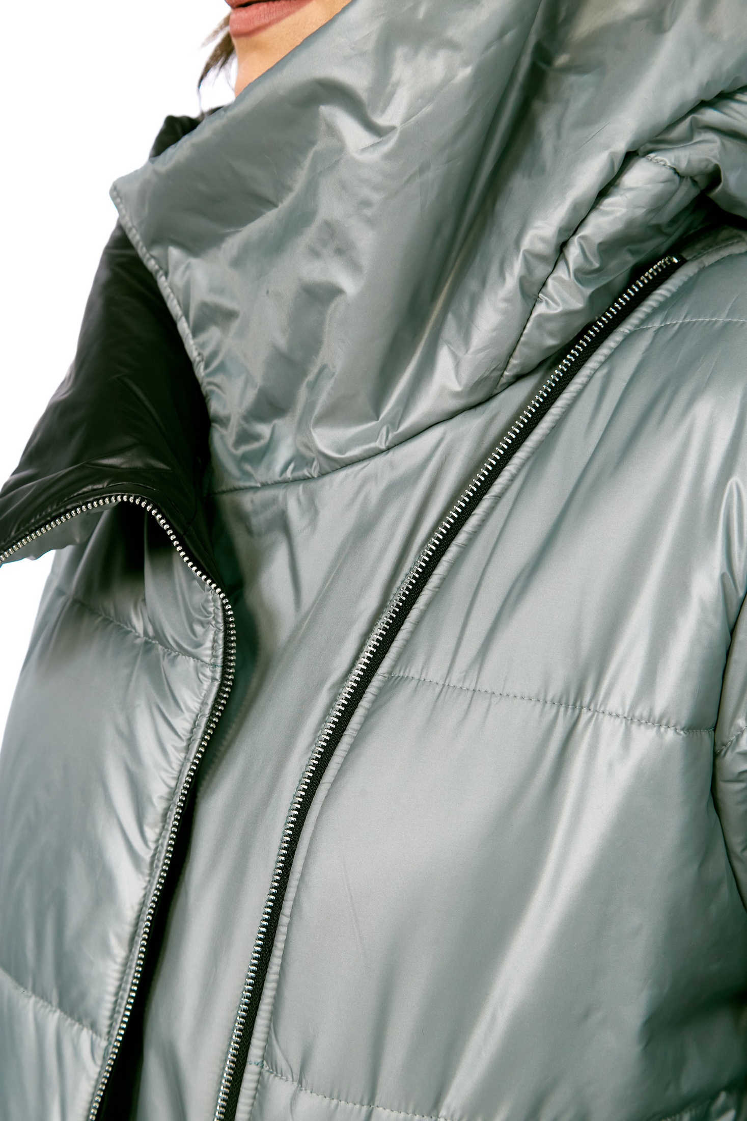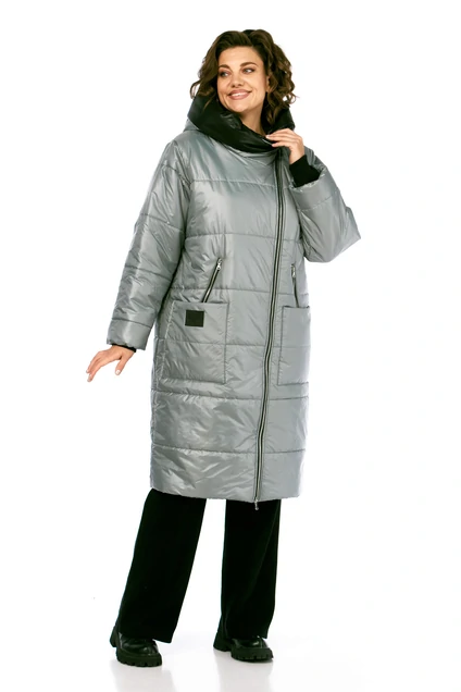 Пальто женское утепленное свободного кроя с ассиметричной застежкой на "молнию". Перед с прорезными карманами с "молнией" и накладными карманами. Правый накладной карман с отделочной нашивкой. Рукав втачной одношовный с трикотажным манжетом выходящим из-под подгибки. Объмный капюшон выполнен из 2-ух видов ткани. Утеплитель Hoopon 200, температурный режим до -10 градусов. Длина по спинке 107, длина рукава 61+5 см.