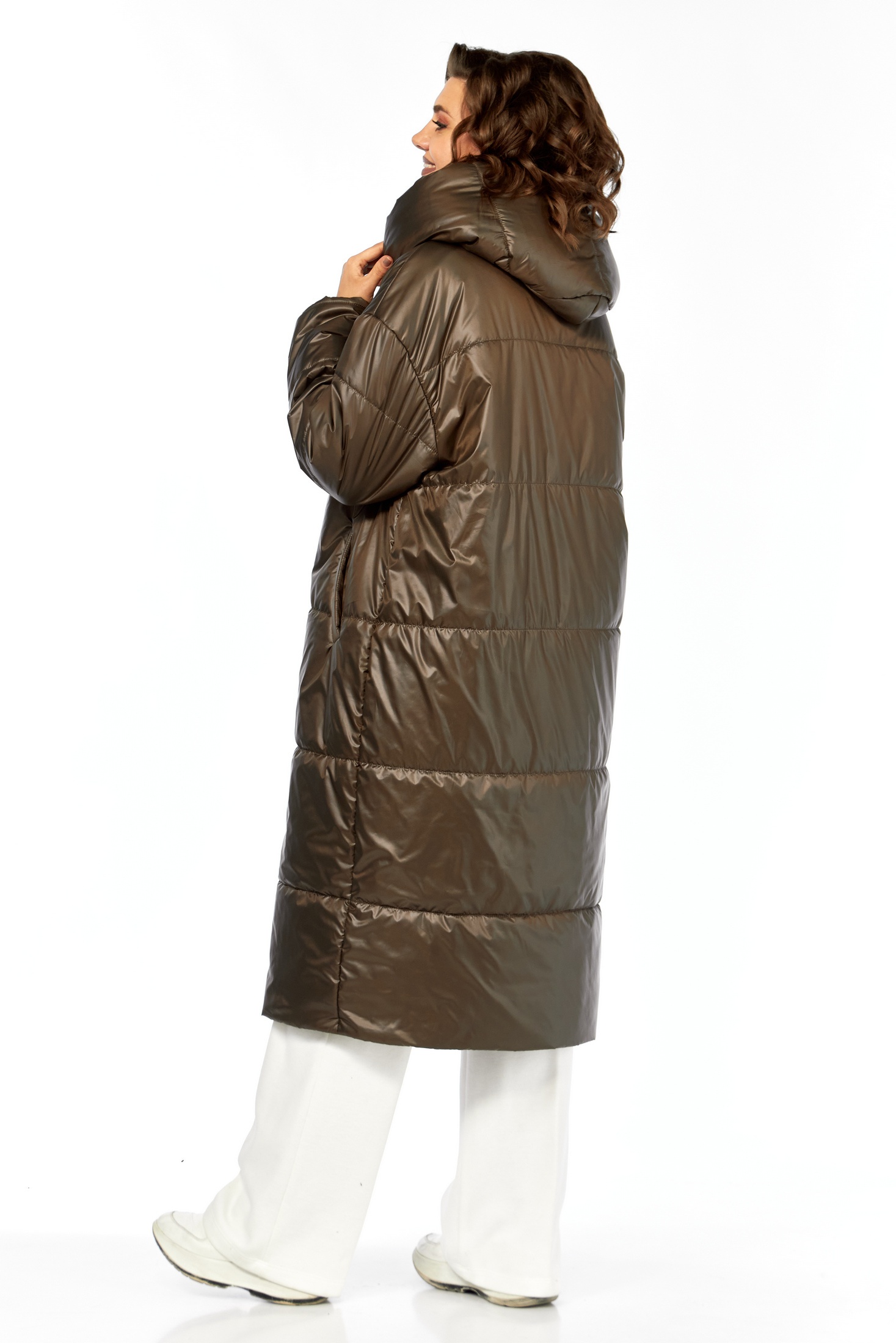 Пальто женскоеполуприлегающего силуэта со смещенной застежкой на кнопки. По переду прорезные карманы с листочкой. Рукав втачной одношовный с притачным манжетом по низу из отделочной ткани (довяз). Капюшон с объемный отделочной деталью по отлету, по горловине переда заложены складки. В качестве отделки используется манишка съемная с застежкой на тесьму-молнию (из отделочной ткани) фиксируется с помощью пуговиц и навесных петель-резинок на изделии. Используется утеплитель синтепон 200. Подходит под температурный режим до -10 градусов. Длина по спинке 116 см, длина рукава 54 см.