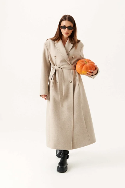 Пальто из пальтовой ткани, прямого силуэта, свободное, со спущенной линией плеча, с центральной двубортной застежкой на петли и пуговицы, отложным воротником и лацканами пиджачного типа, на подкладке. Полочки с отрезными бочками и карманами в швах. Спинка со средним швом и шлицей, с отрезными бочками и плечевыми вытачками. Рукав втачной, длинный, двухшовный. В комплекте пояс из основной ткани.