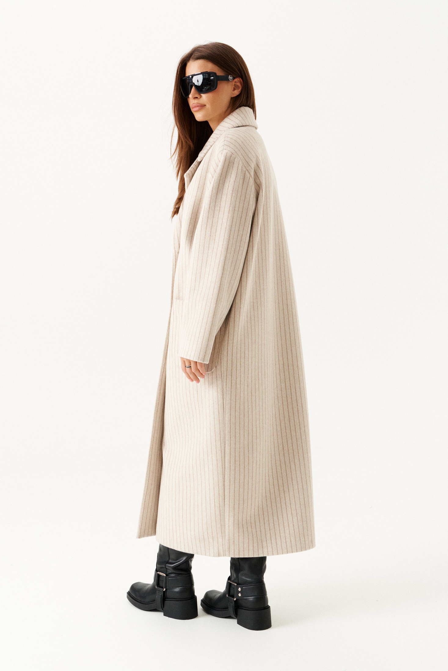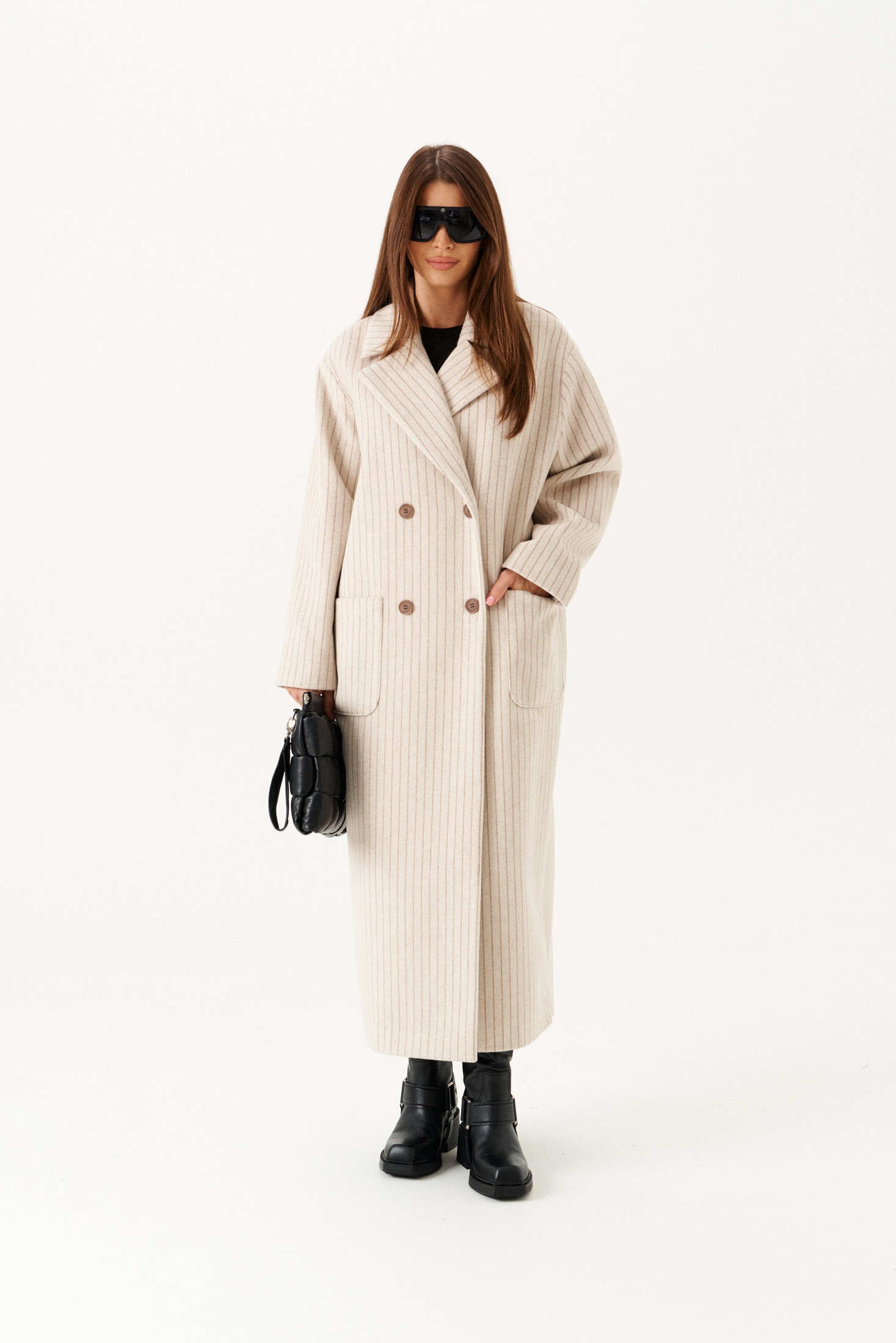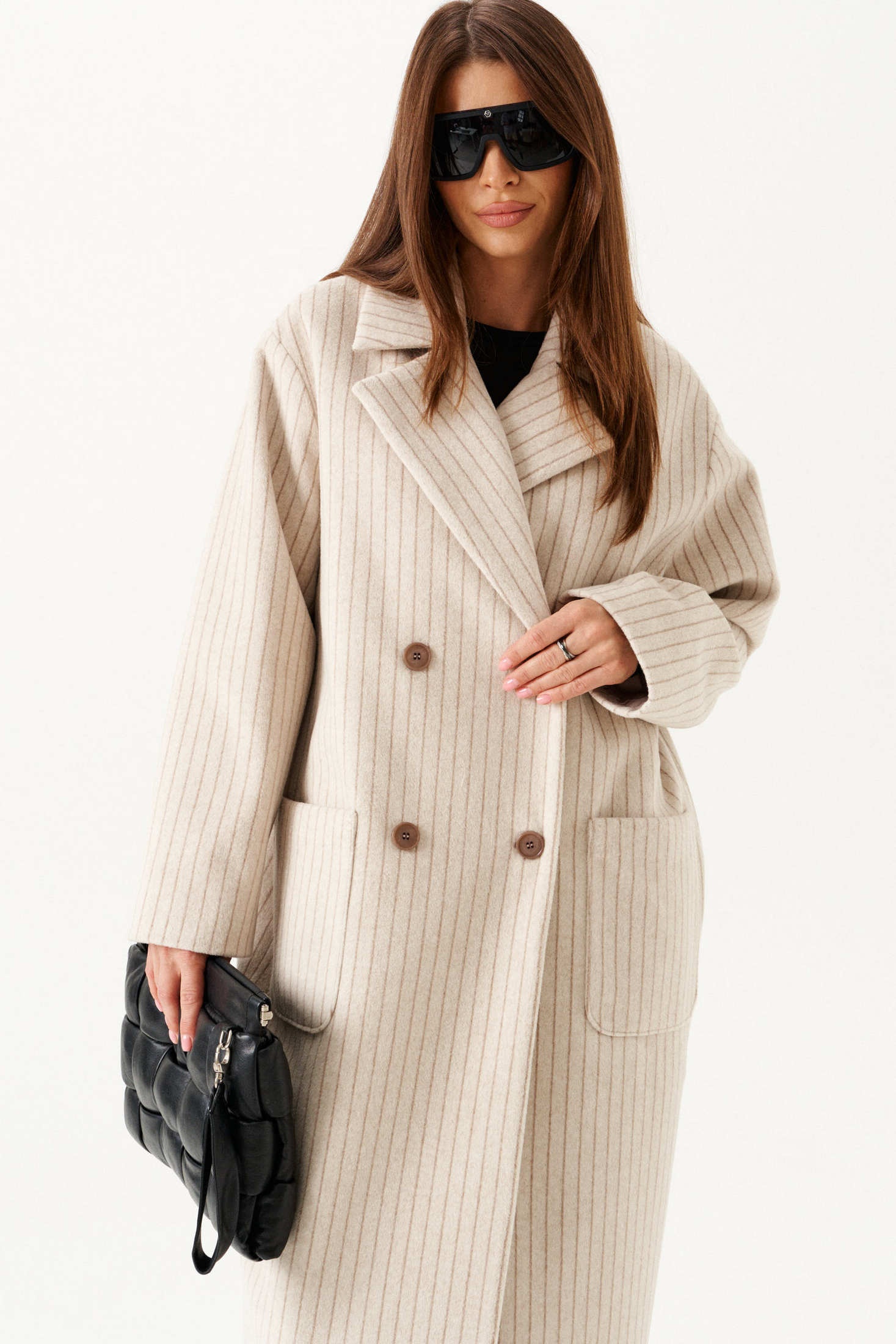 Пальто из трикотажного полотна, прямого силуэта, свободное, с центральной двубортной застежкой на петли и пуговицы, отложным воротником и лацканами пиджачного типа, на подкладке. Полочки с накладными карманами. Спинка цельная. Рукав втачной, длинный,одношовный.