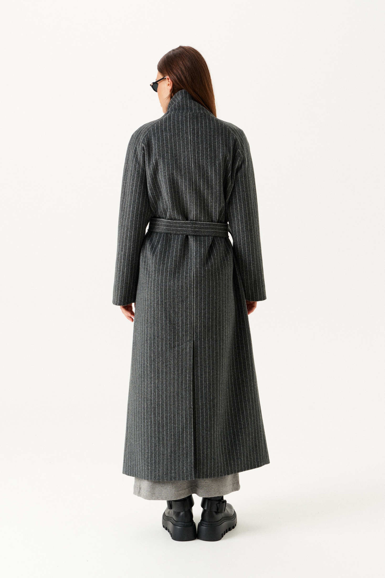 Пальто из трикотажного полотна прямого силуэта, с центральной двубортной застежкой на петли и пуговицы, на подкладке. Воротник – стойка с застежкой на петли и пуговицы. Полочки с прорезными карманами с листочкой. Спинка со средним швом и шлицей. Рукав – реглан. В комплекте пояс из основной ткани.