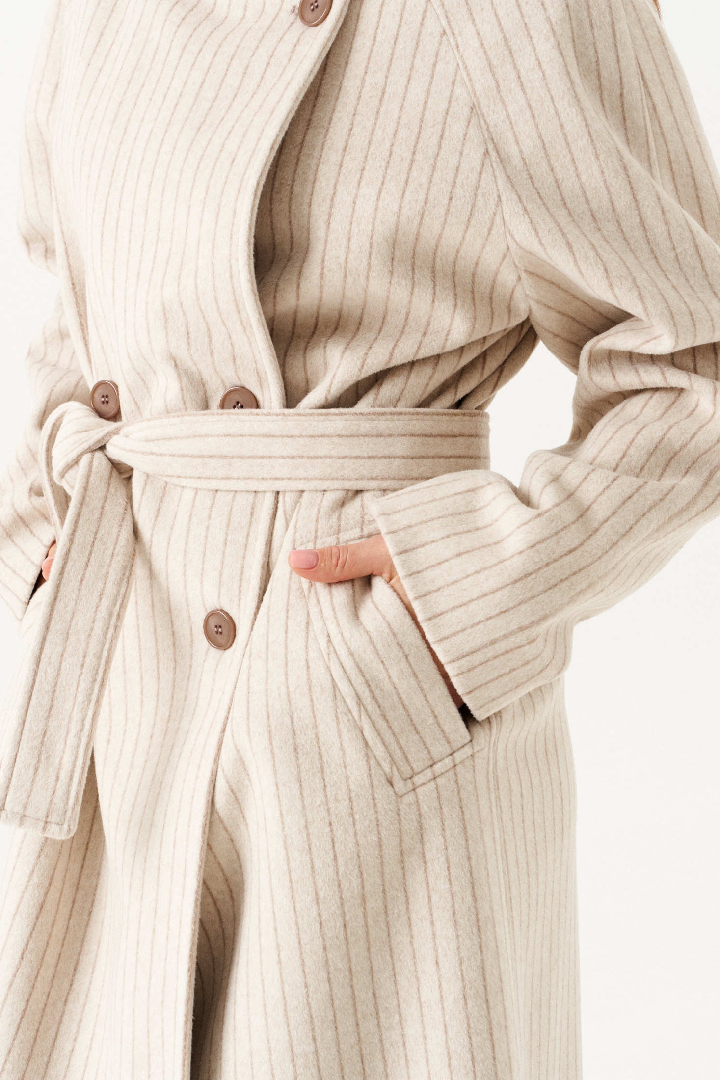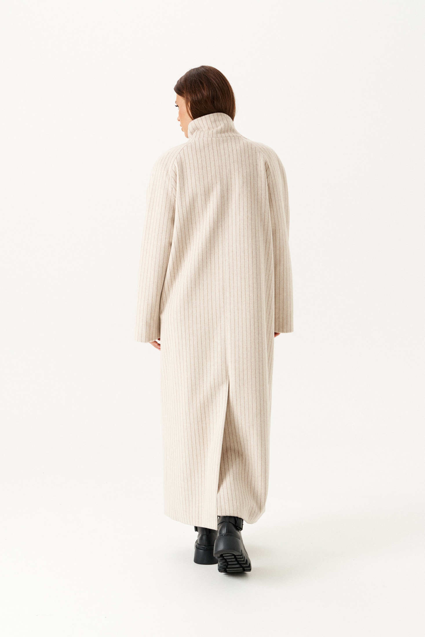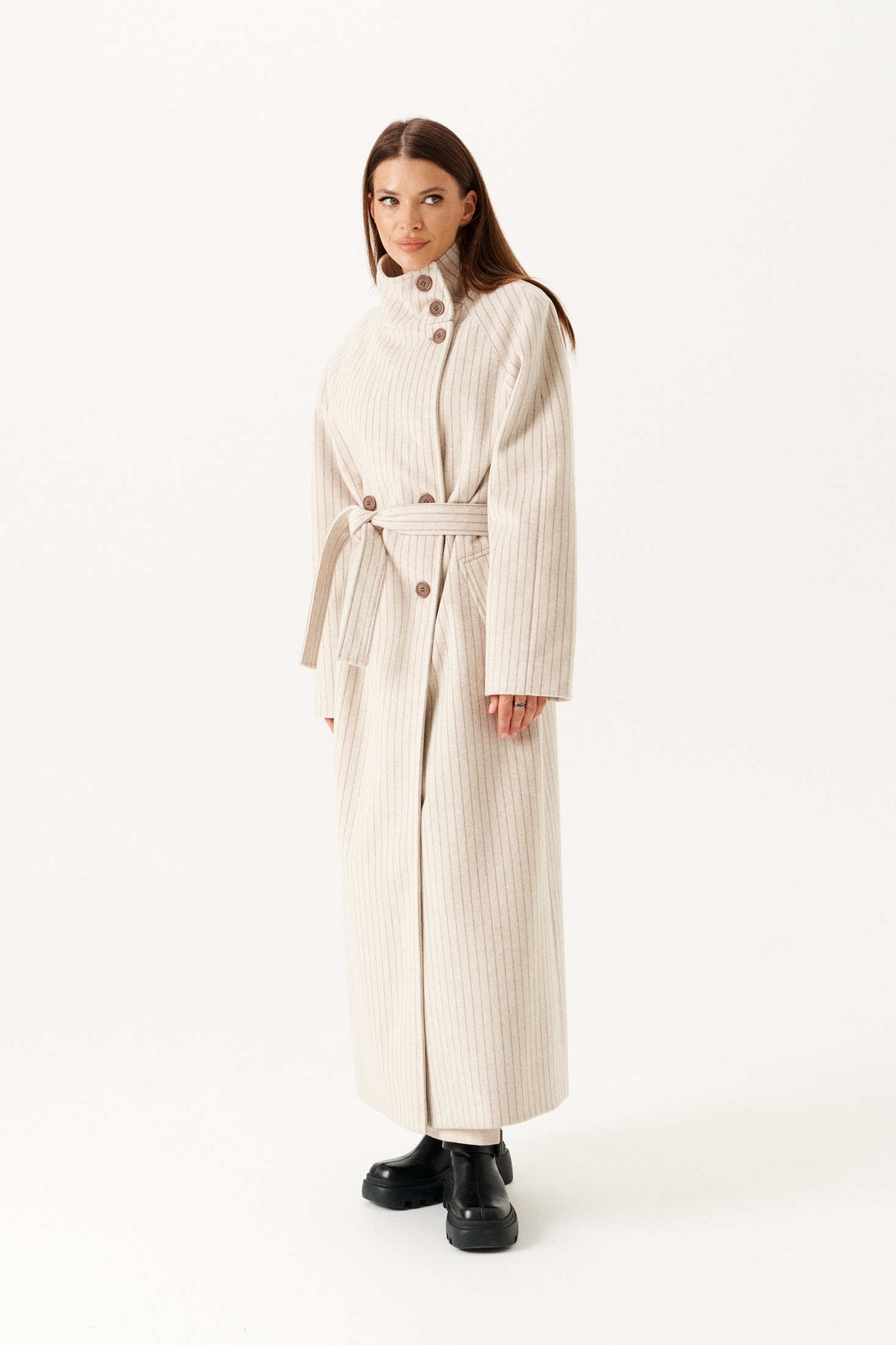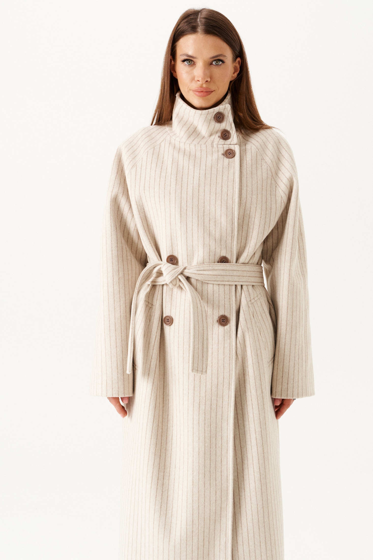Пальто из трикотажного полотна прямого силуэта, с центральной двубортной застежкой на петли и пуговицы, на подкладке. Воротник – стойка с застежкой на петли и пуговицы. Полочки с прорезными карманами с листочкой. Спинка со средним швом и шлицей. Рукав – реглан. В комплекте пояс из основной ткани.
