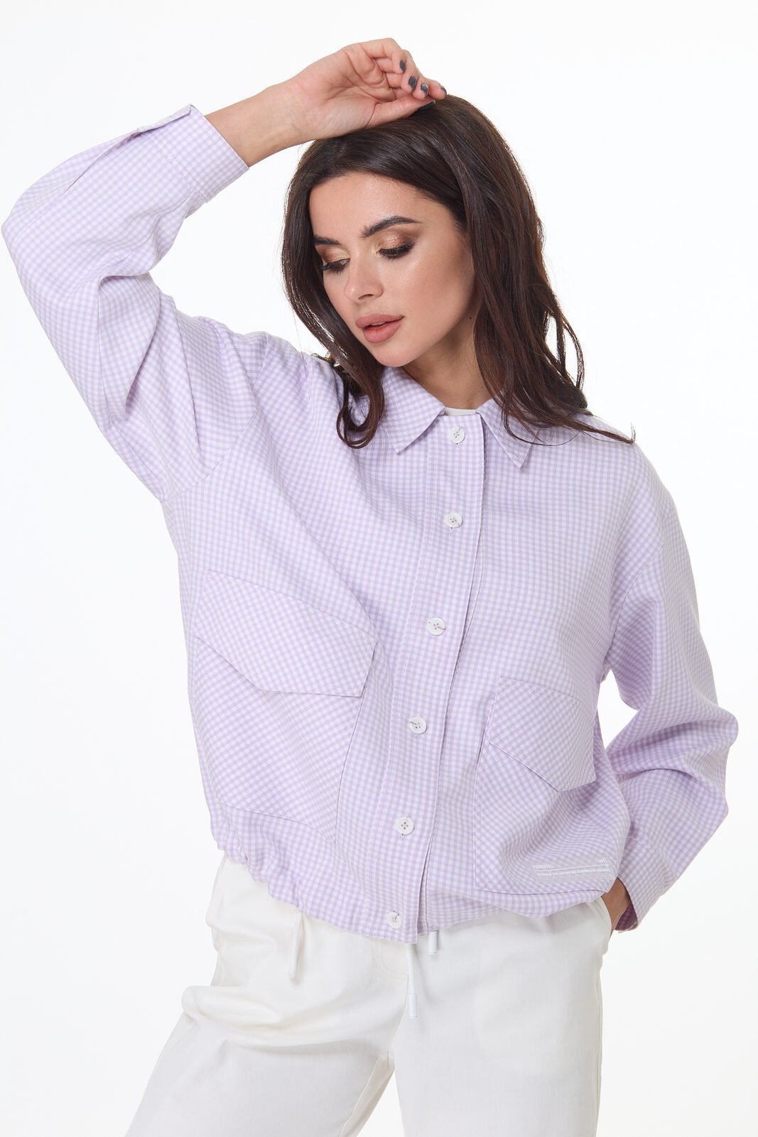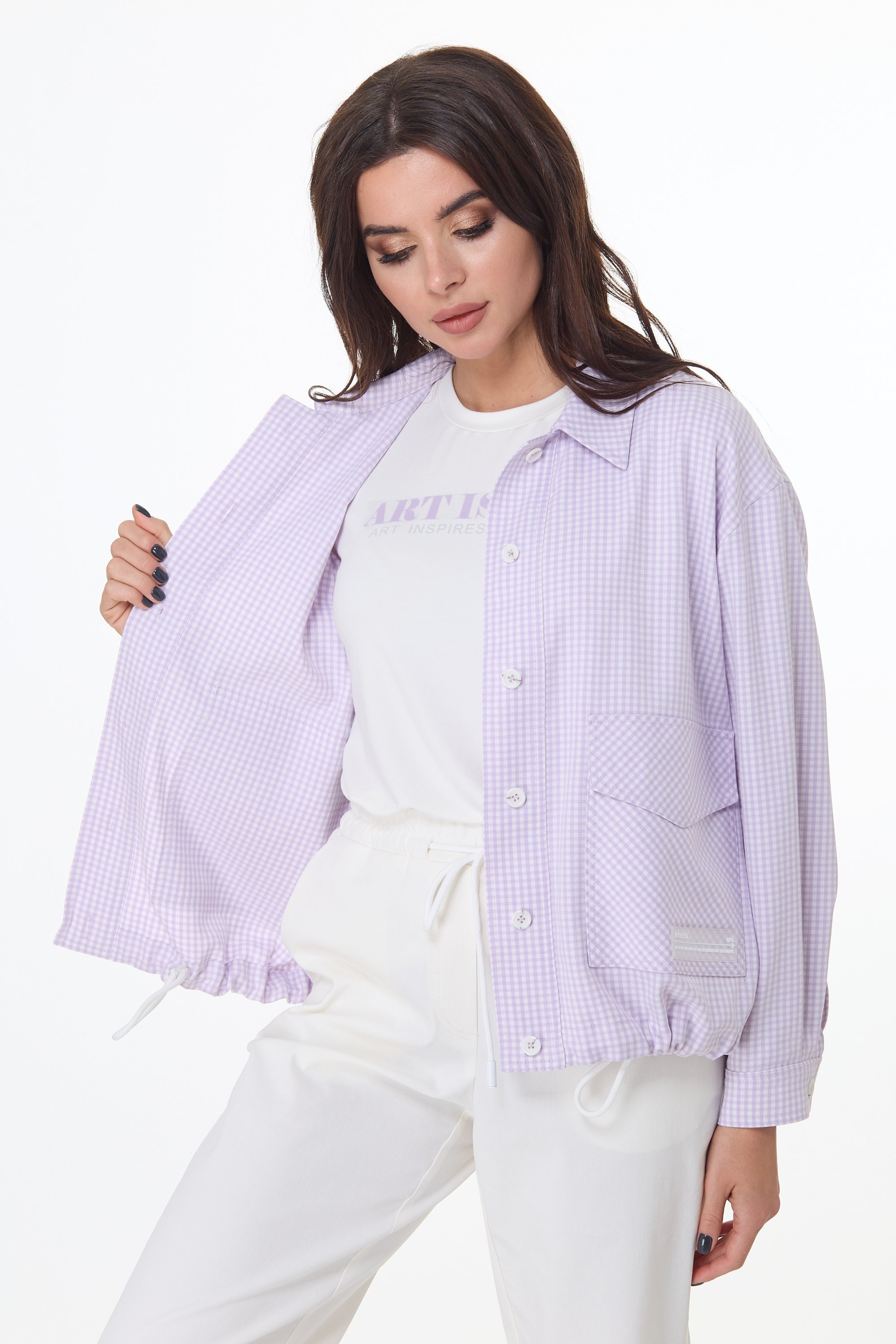 Коплект, состоящий из бомбера, футболки и брюк - джоггеров. Бомбер прямого силуэта с застежкой на петли - пуговицы, со спущеной линией плеча. По переду накладные карманы с клапанами. Рукав рубашечный, по низу которого манжета. По низу куртки шнур контрастного цвета , который регулируется фиксаторами. Топ полуприлегающего силуэта с круглым вырезом горловины. По переду - принт контрастного цвета.