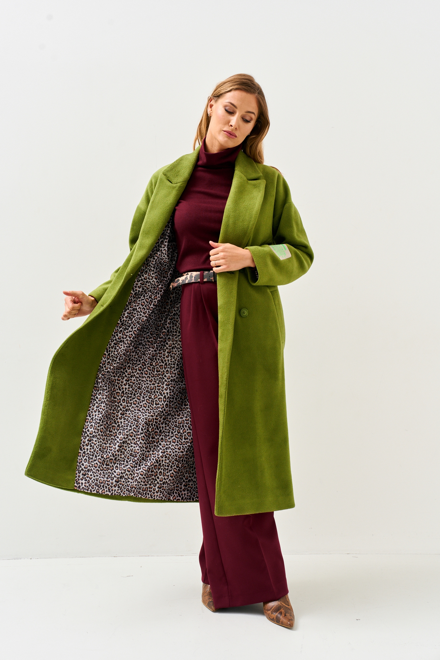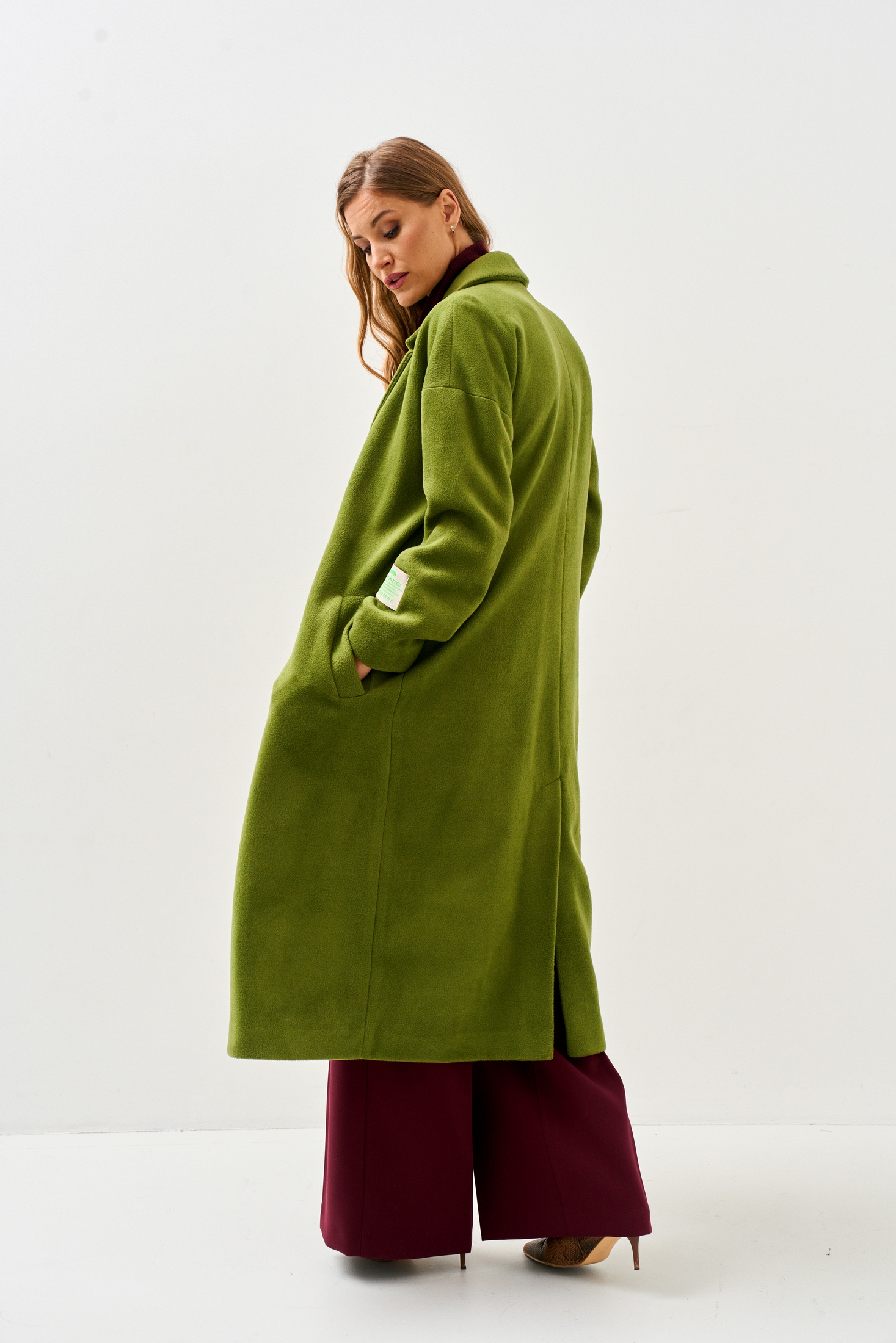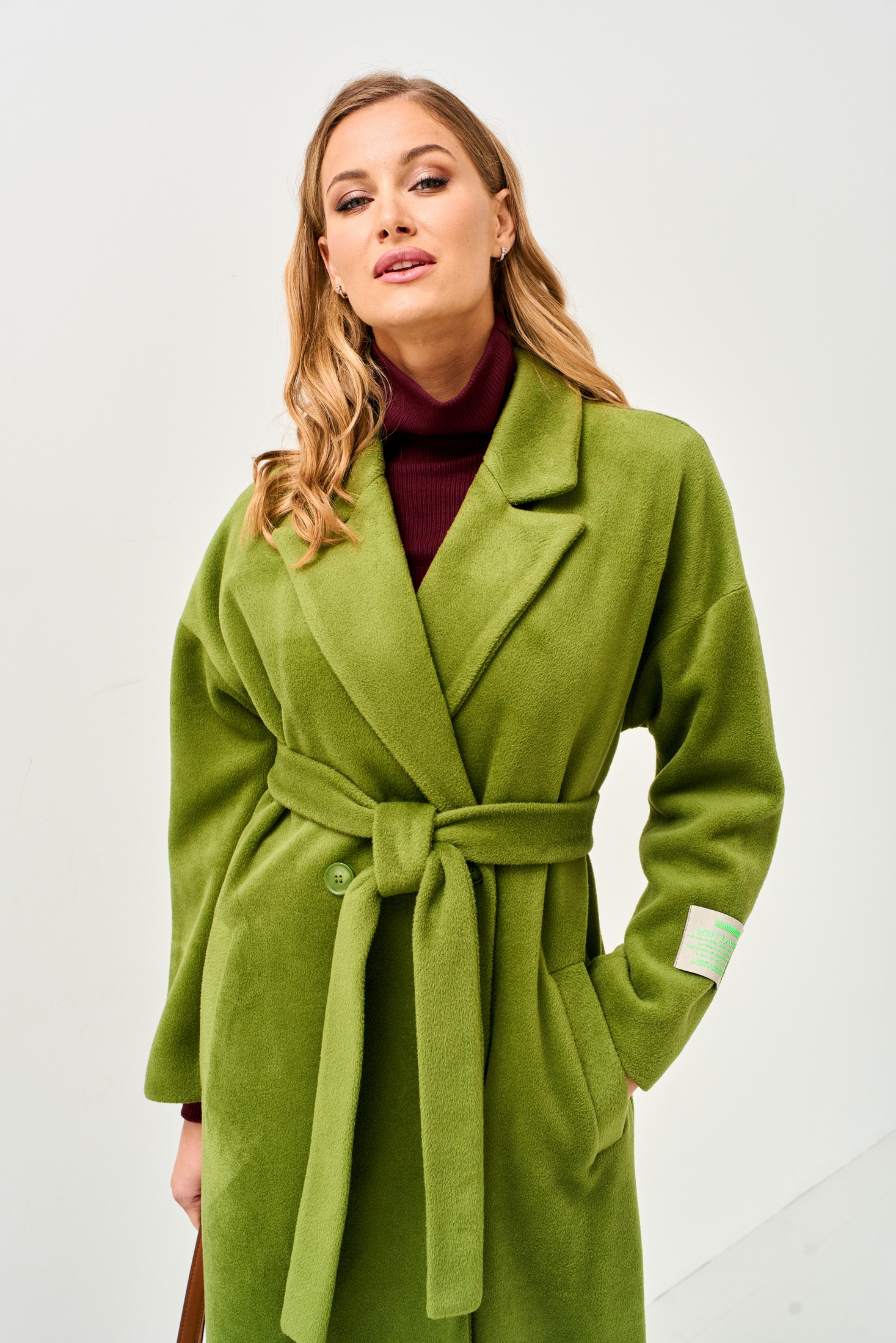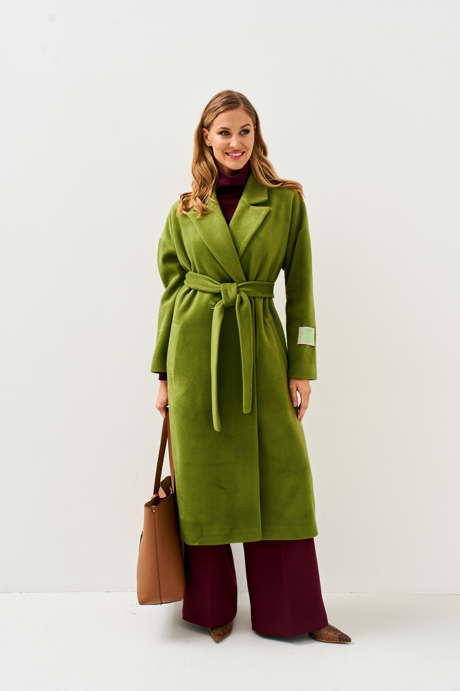 Пальто женское прямого силуэта на подкладке, со смещенной бортовой застежкой на петли и пуговицы, с отложным воротником и спущенным ркуавом. На деталях переда обработаны боковые прорезные карманы с листочкой. Спинка разрезная. Пояс сьемный.