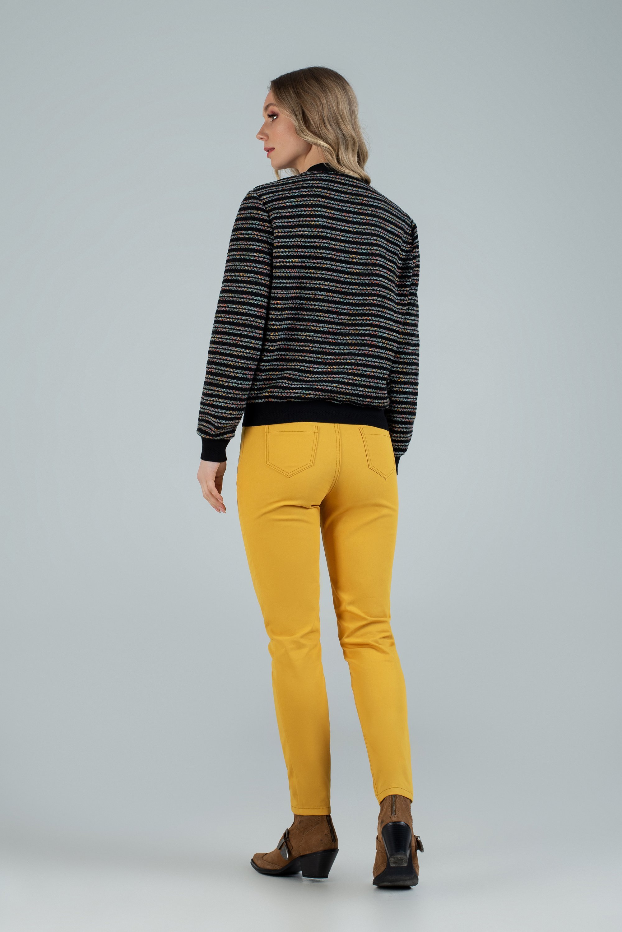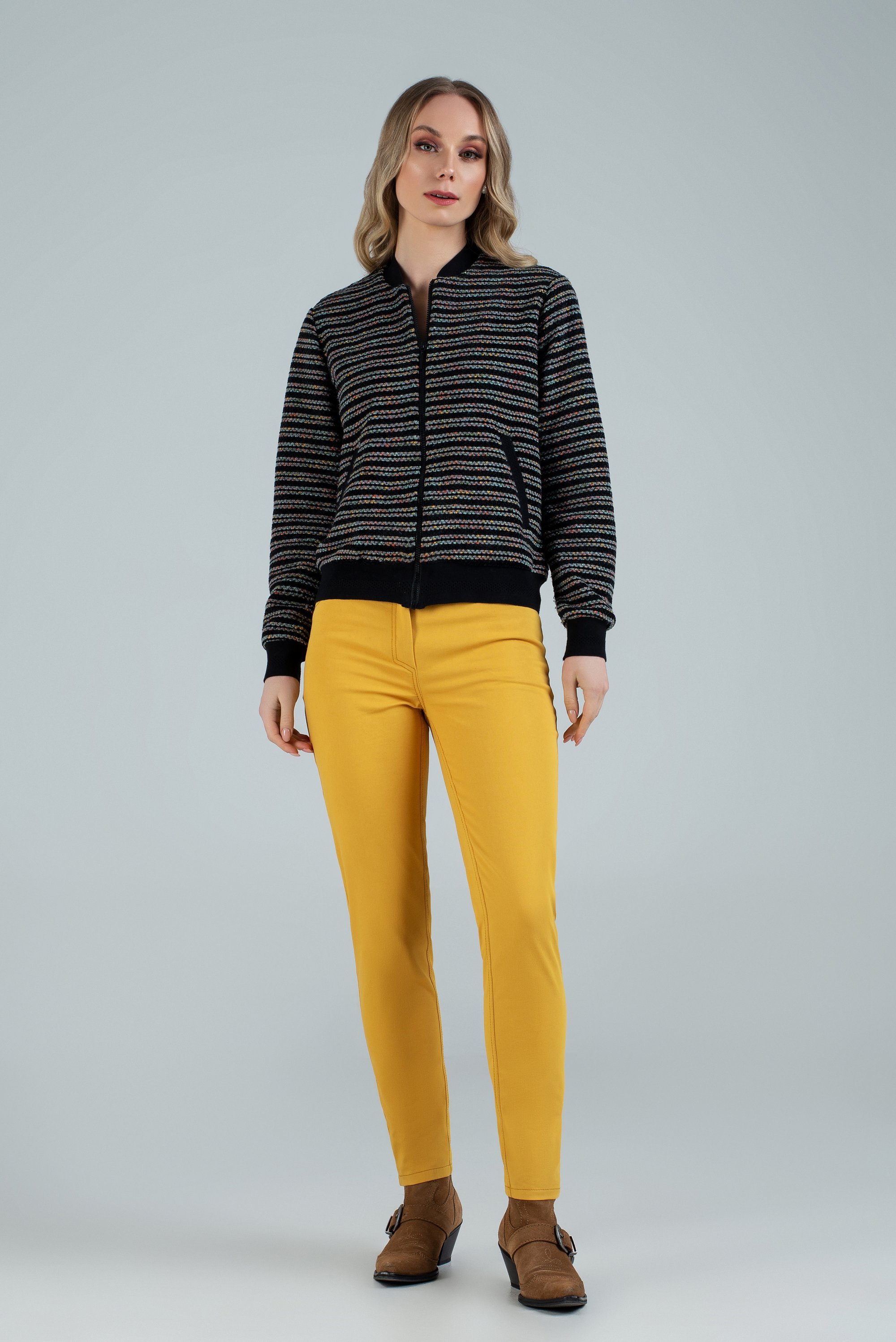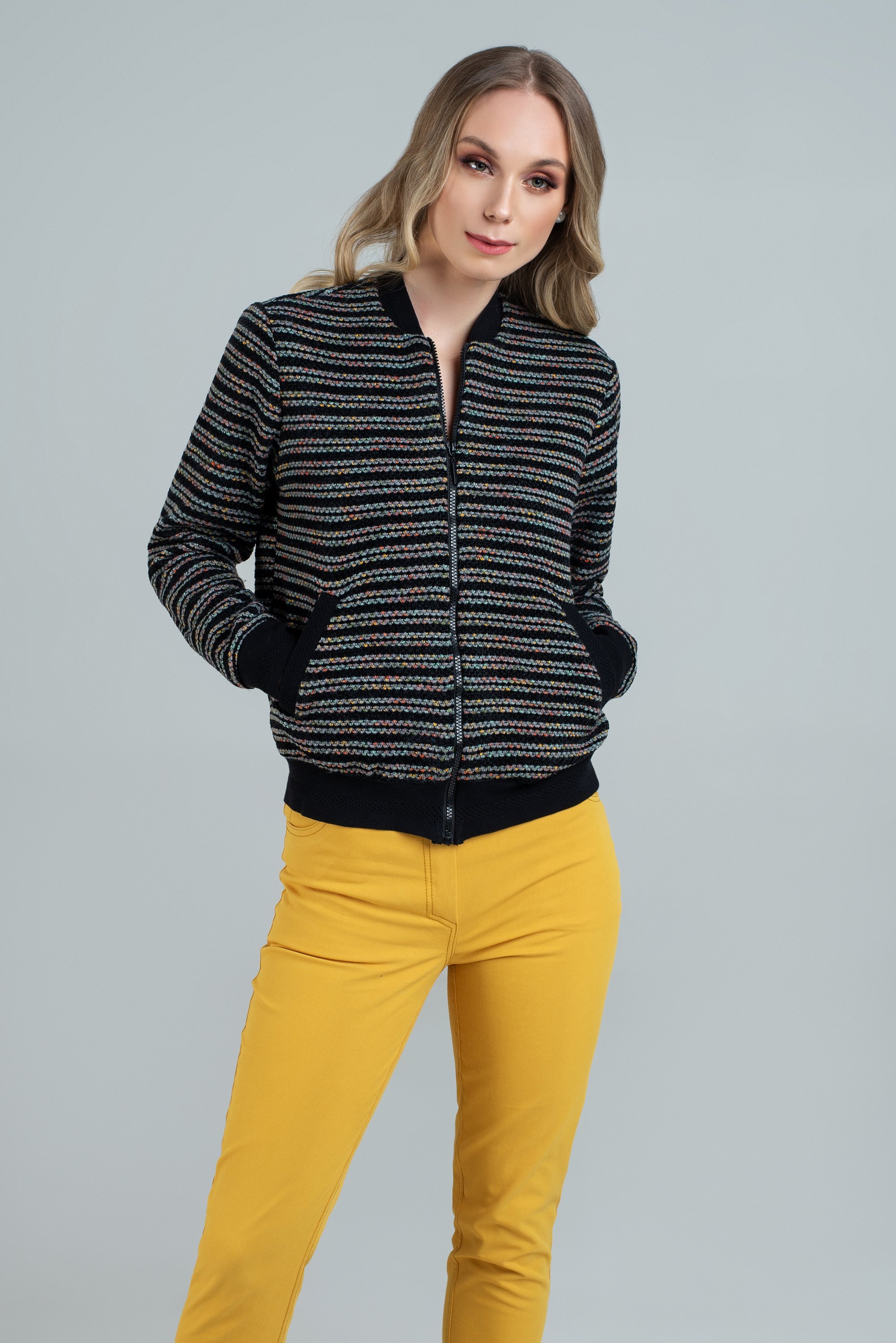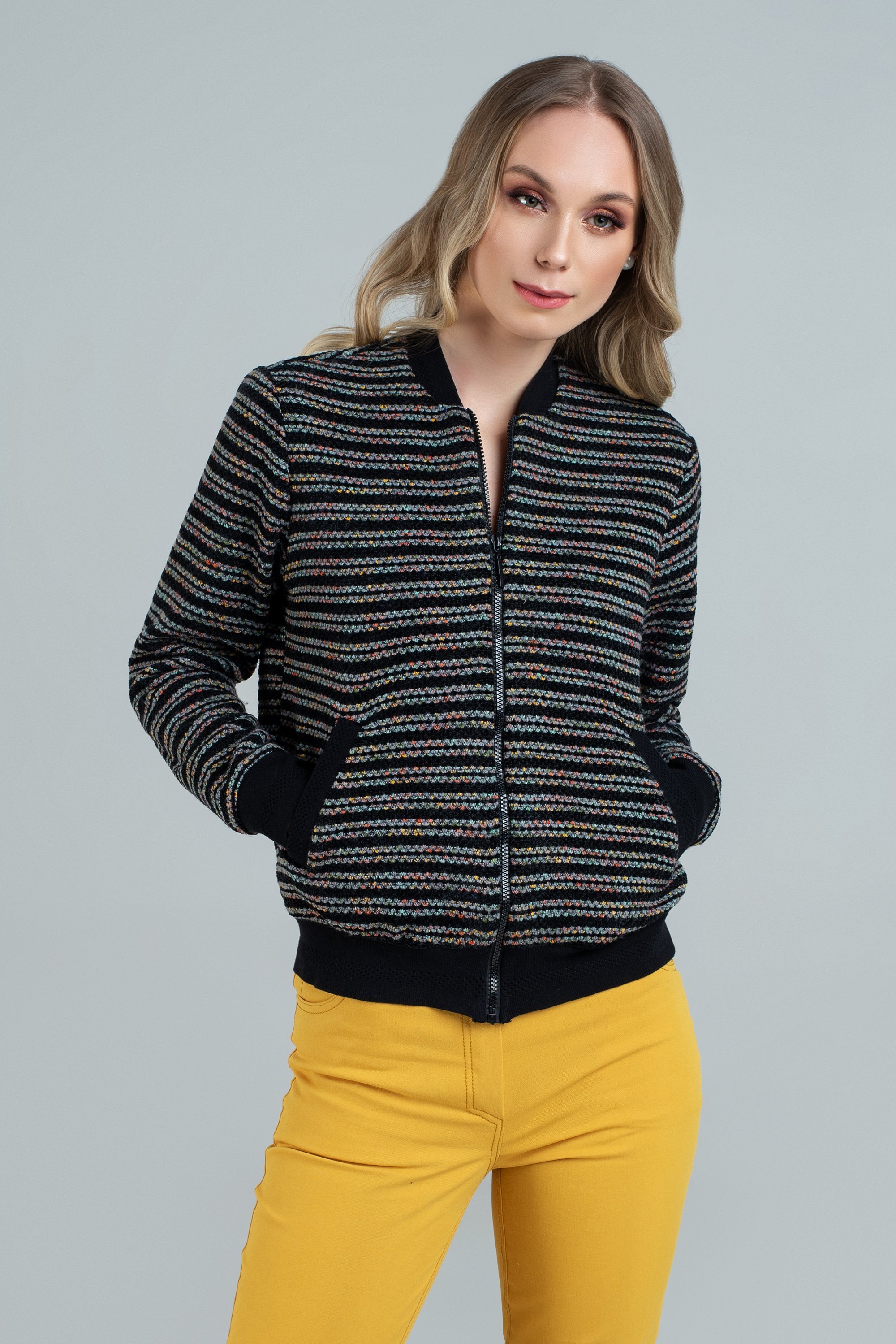 Бомбер женский выполнен из трикотажной ткани. Застёжка бомбера спереди на молнию, спереди расположены карманы. Низ, рукава и горловина бомбера выполнены из трикотажного довяза чёрного цвета.