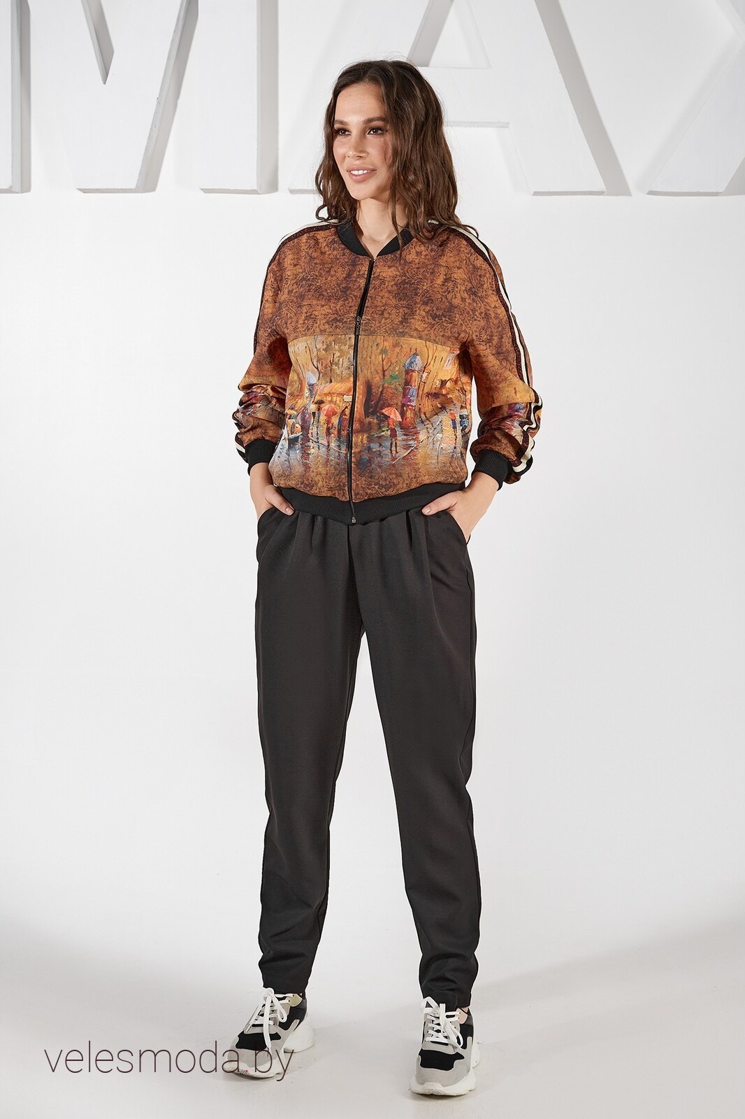Бомбер свободного кроя, со спущенной линией плеча и центральной застёжкой на металлическую тесьму "молнию". Перед с подрезом, переходящим в складку и боковыми карманами. Спинка так же с подрезом, переходящим в складку. Горловина, манжет рукава и низ из плотной трикотажной ткани. По плечевому шву и середине рукава настрочена декоративная тесьма.