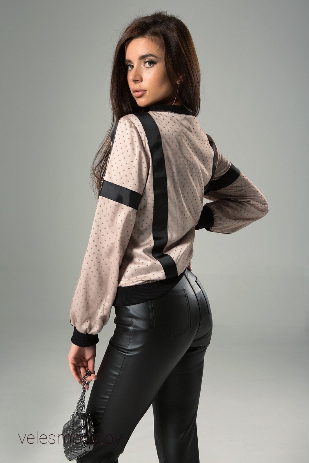 Бомбер прямого силуэта с трикотажной резинкой по горловине и низу. Перед, спинка и рукава с настрочными репсовыми лентами. Застёжка центральная на тесьму-молнию. Нижний слой из однотонной ткани. Верхний слой из фатина в горох.
