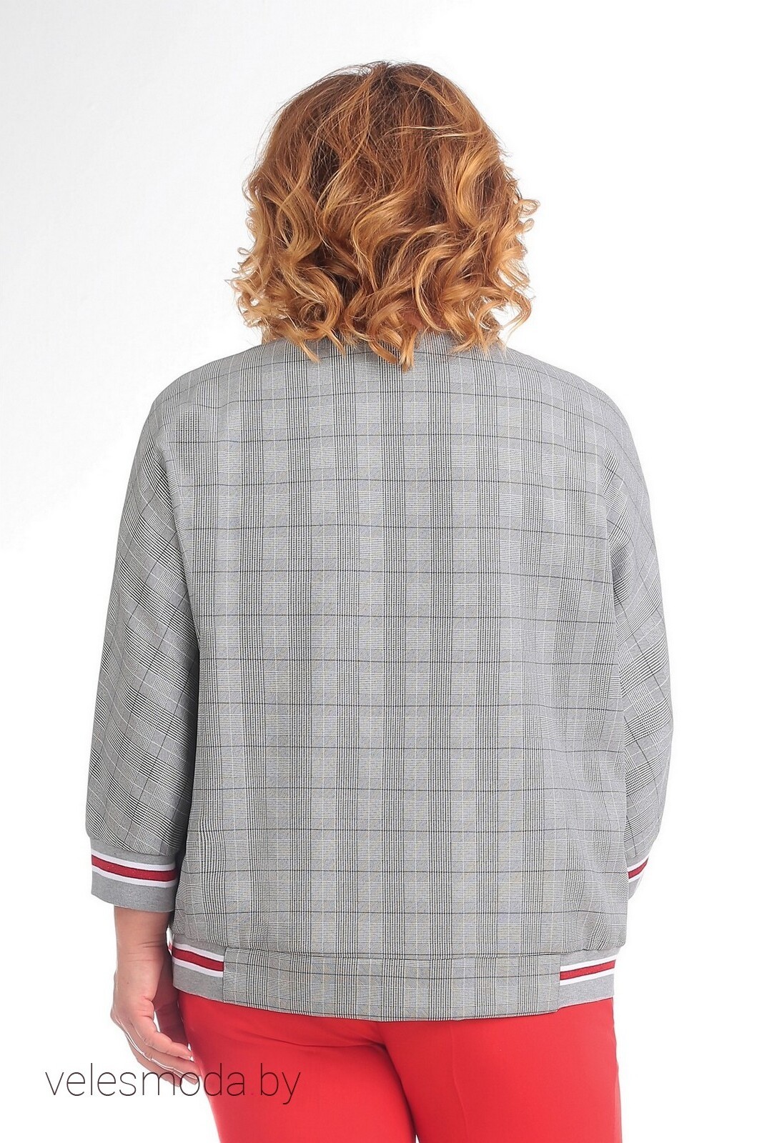 Бомбер с цельновыкроенными рукавами на манжетах в ¾ длины, застежка центральная бортовая на петли и пуговицы, прорезанные карманы, воротник переда, манжеты и низ обработаны с трикотажным довязом. Длина бомбера – 88см.