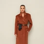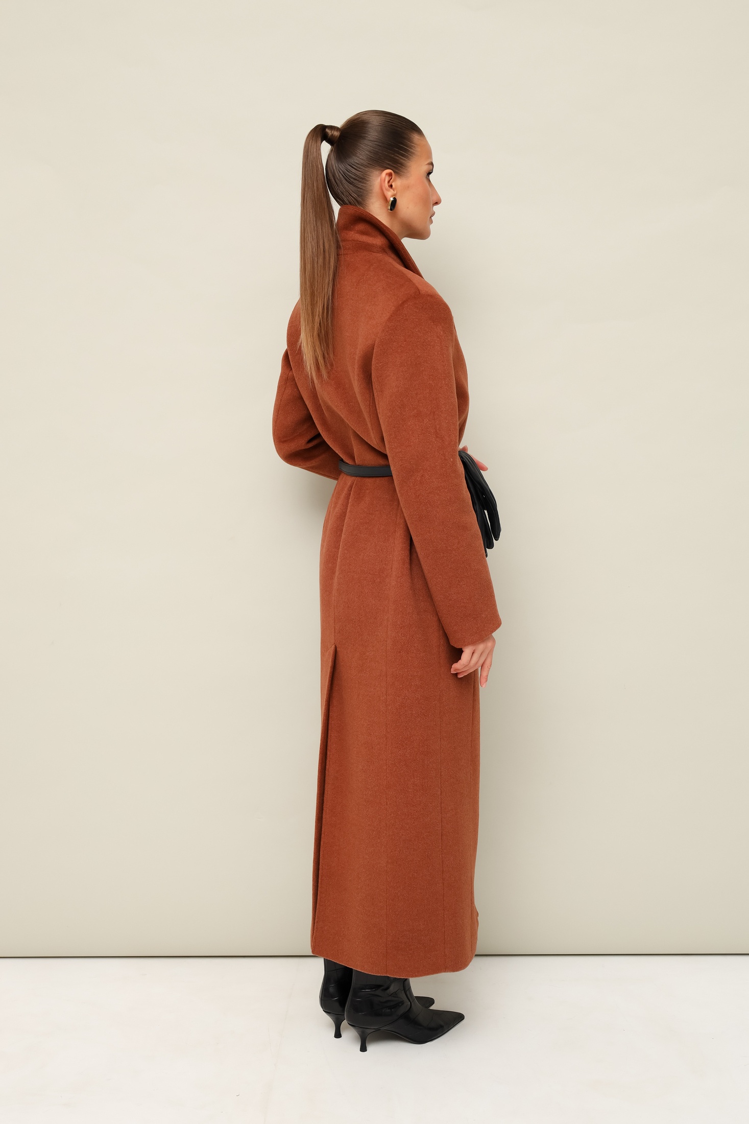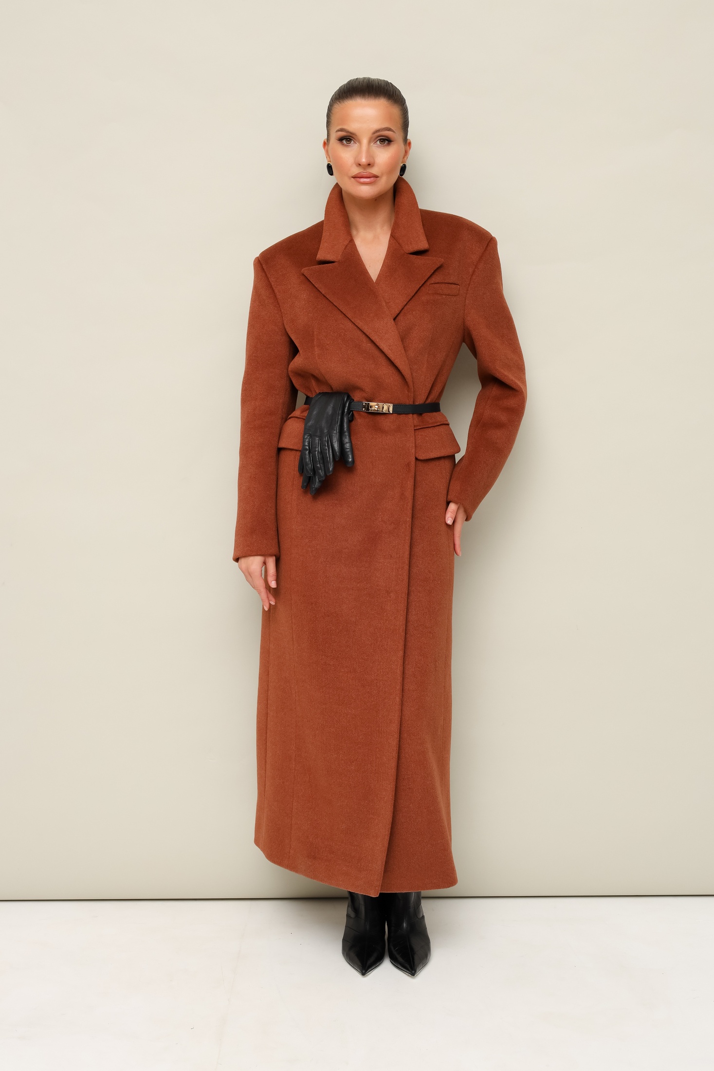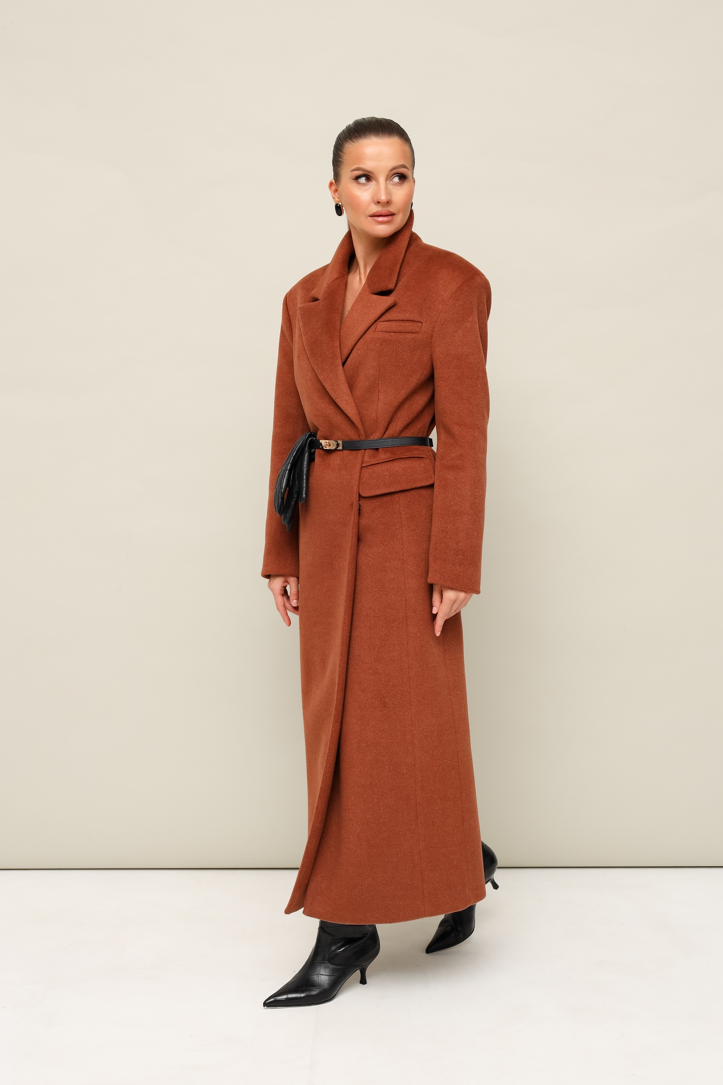 Демисезонное пальто прямого силуэта, выполнено из качественной пальтовой ткани. Воротник пиджачного типа с отложными лацканами. Двубортная застёжка на потайные пришивные кнопки. Слегка удлиненный плечевой шов. Спереди обработаны прорезные карманы в рамку с клапанами и нагрудный прорезной карман с листочкой. Рукава втачные, двухшовные. Спинка со средним швом, переходящим в шлицу. Пальто на подкладке.