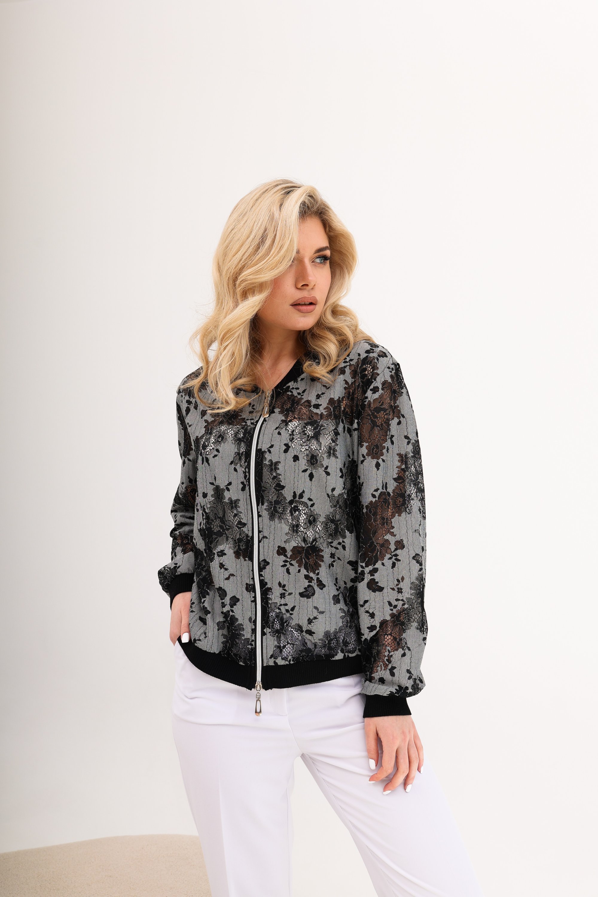 Повседневный бомбер классического кроя с застежкой на тесьму-молнию, выполненный из кружевной сетки с объемными цветами. Благодяря материалу исполнения, изделие создает эффектный образ.Манжеты рукавов, воротничок и пояс по низу бомбера выполнены из декоративных трикотажных довязов.