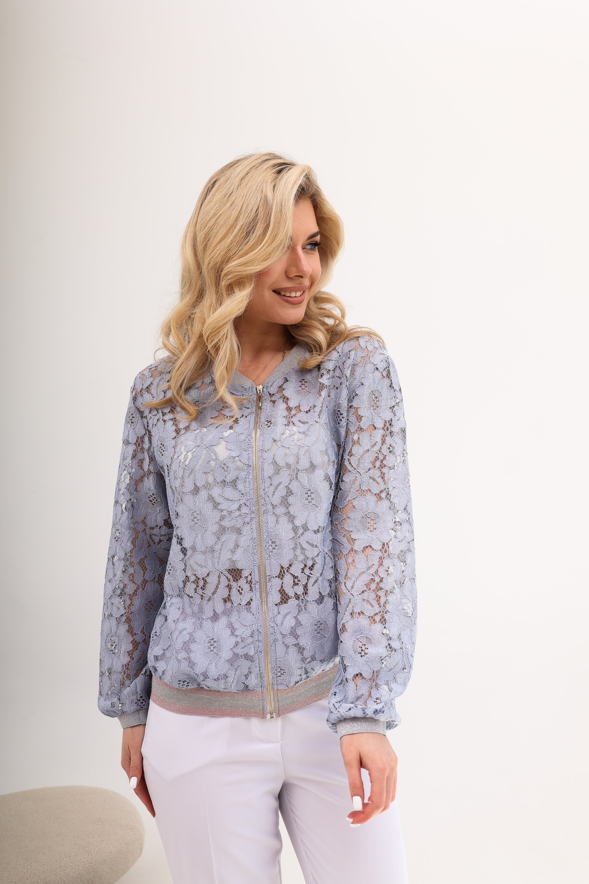 Повседневный бомбер классического кроя с застежкой на тесьму-молнию, выполненный из кружевной сетки с объемными цветами. Благодяря материалу исполнения, изделие создает эффектный образ.Манжеты рукавов, воротничок и пояс по низу бомбера выполнены из декоративных трикотажных довязов.