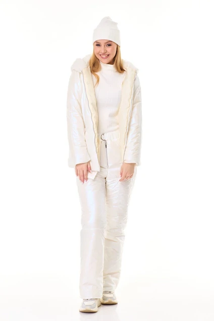 Зимний воздушный комплект в нежном перламутровом цвете с меховой отделкой состоит из куртки и утепленных брюк.