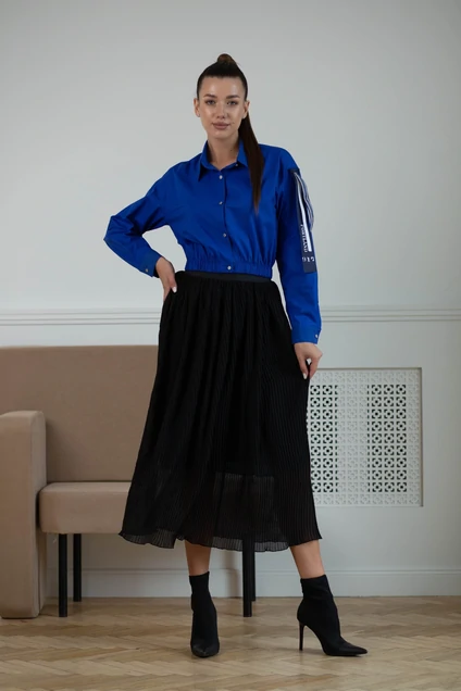 Элегантная юбка длиной миди, драпирующаяся, из плиссированного шифона на эластичной декоративной резинке. Расположение полос придаёт изделию эффект волн и воздушности. В бедрах свободная, за счет резинке имеет плавающий размер. Изделие на подкладе.