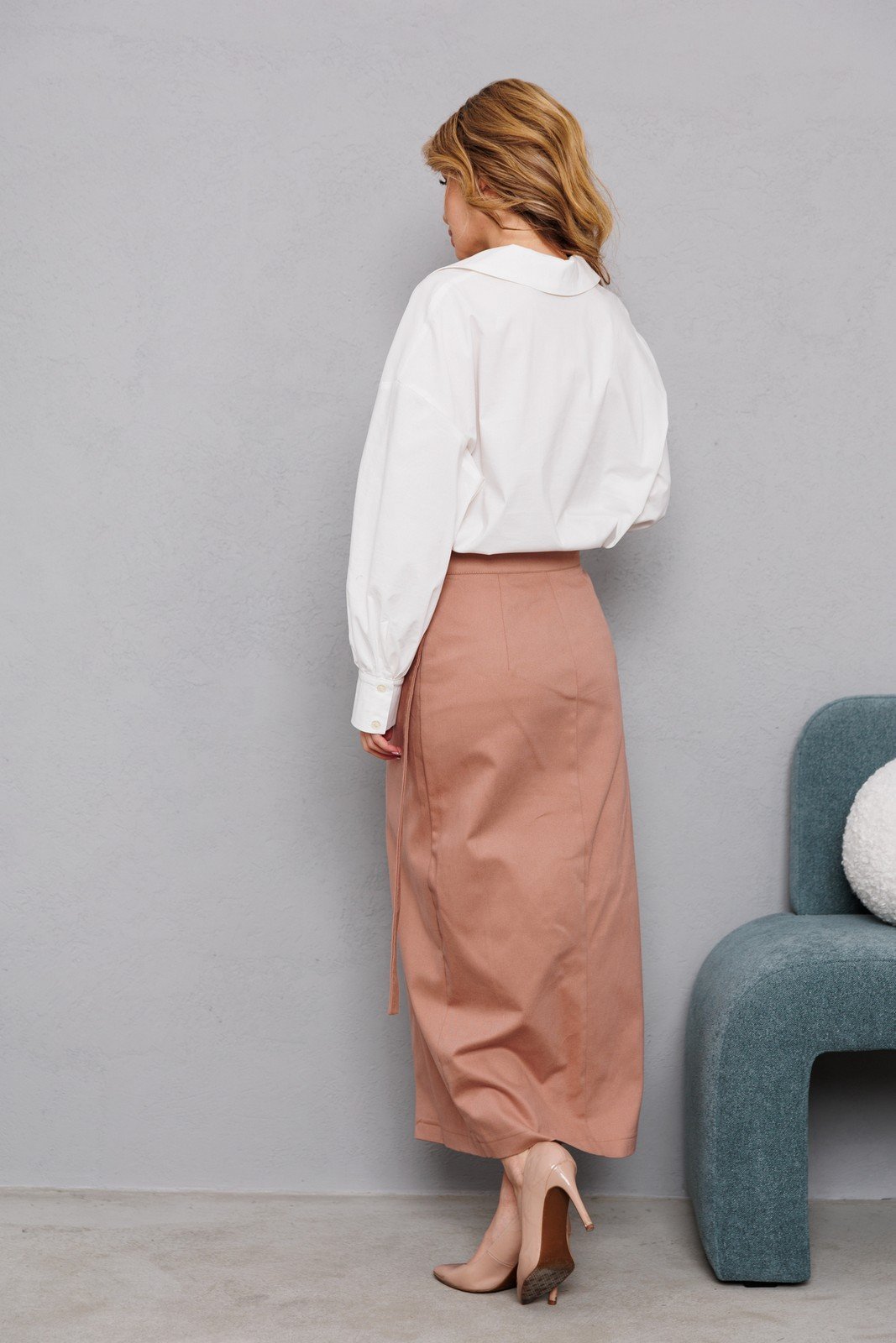 Элегантная джинсовая юбка на запах выполнена в приятном пастельно-коралловом оттенке, который станет изысканным дополнением к вашему гардеробу. Модель застегивается на пуговицу на талии и дополнительно фиксируется при помощи стильного текстильного пояса с полукольцами. Широкий фасон дополняет образ свободой и легкостью, делая юбку идеальным выбором для создания как повседневных, так и более официальных образов.