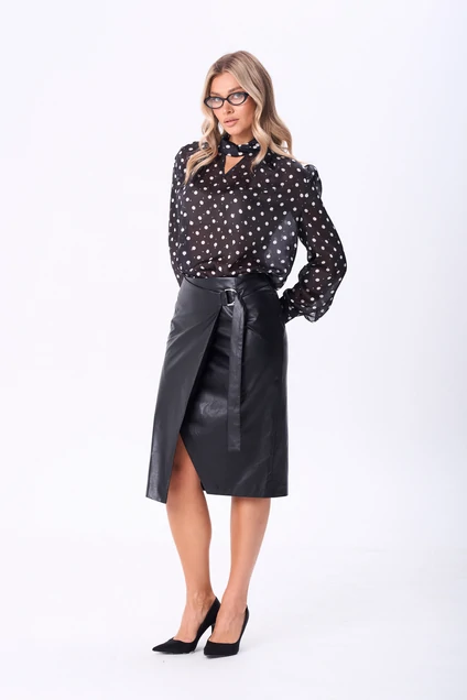Элегантная миди-юбка прямого силуэта, по переду отлетная деталь формирует запах, который фиксируется поясом и пряжкой. Верхний срез обработан обтачкой, благодаря чему обеспечивает идеальную посадку, практичность добавляет потайная молния по спинке в среднем шве юбки. Идеальный выбор для создания стильного делового образа.