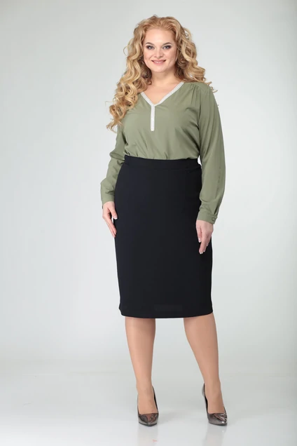 Юбка выполнена из однотонной ткани, прилегающая в области бедер и зауженая к низу, длиной за колено. Юбка на подкладке, передняя и задняя части с талиевыми вытачками. По линии талии юбка на притачном поясе с эластичной тесьмой и застежкой на две петли и пуговицы, сзади в нижней части шлица.