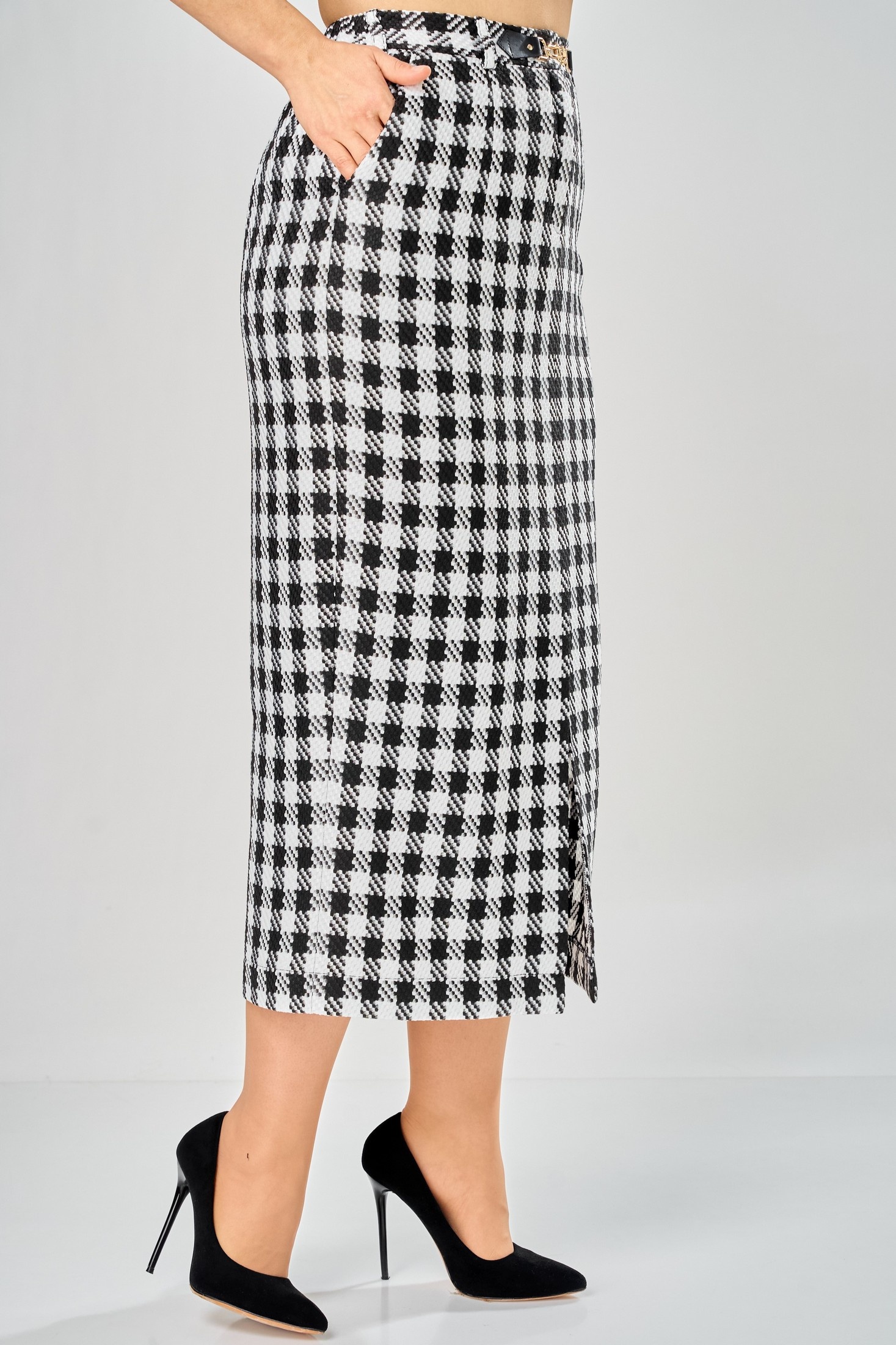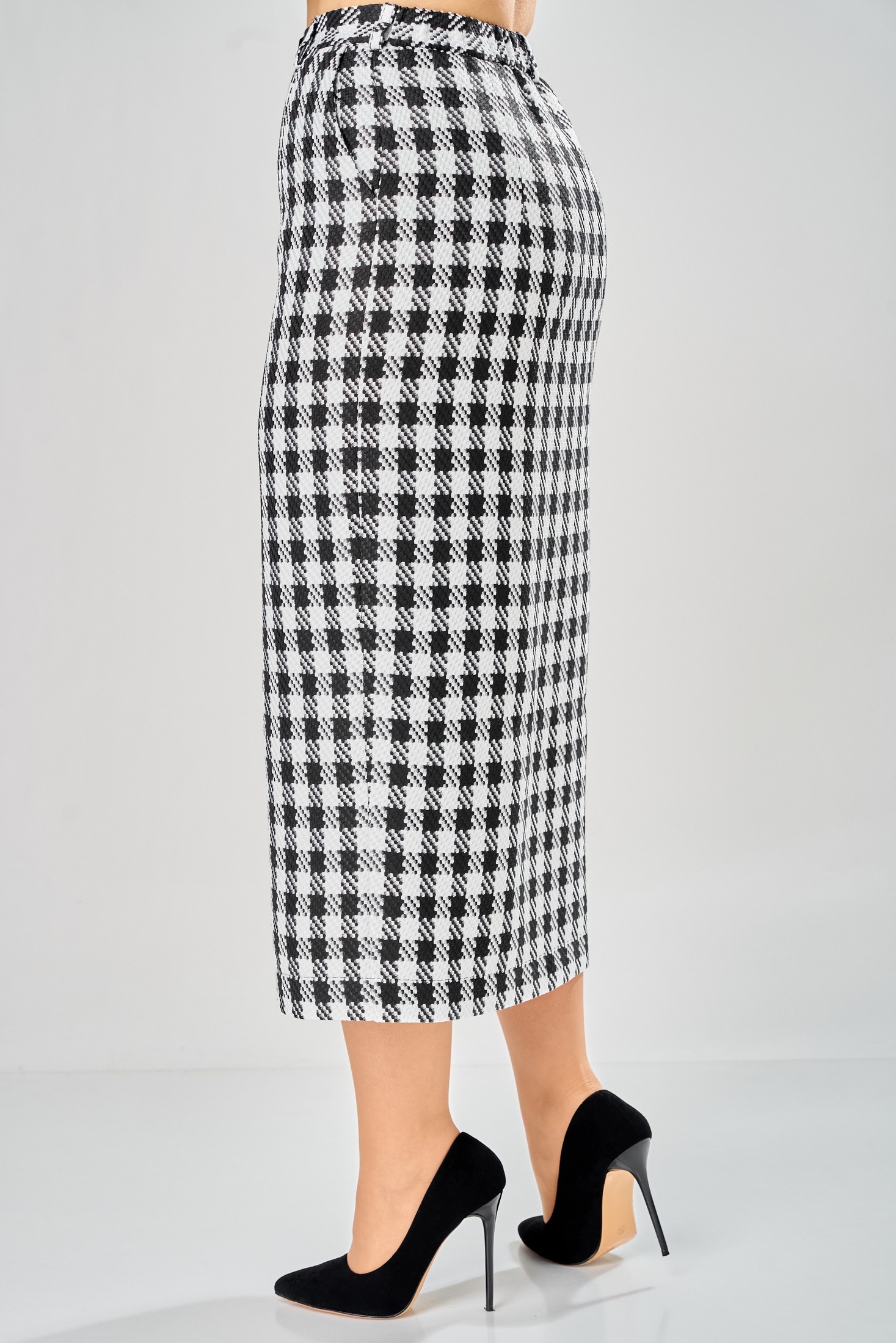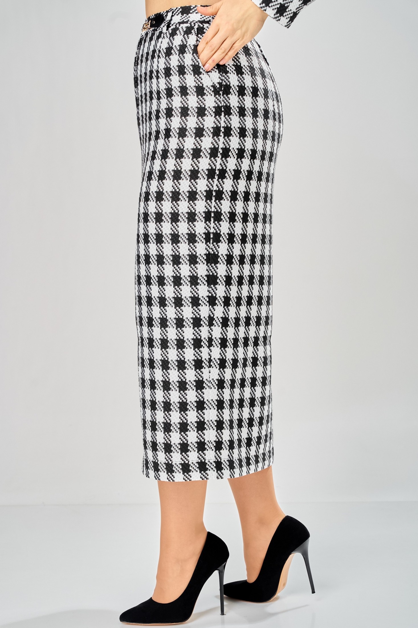 Юбка 1026-26 черный + белый ANDINA CITY станет идеальной основой для вашего гардероба. Эта дизайнерская модель в клетку воплощает классику и универсальность, предлагая длину миди и фасон карандаш. Коллекция бренда ANDINA CITY использует материал, сочетающий полиэстер и вискозу, что обеспечивает комфорт и легкость в носке. Декоративная застежка и стильная шлица спереди подчеркивают внимание к деталям, а черно-белая гамма придаёт универсальный характер, подходящий для любого сезона. Подкладка из мягкой ткани слегка облегает фигуру, даря чувство уюта весь день. Юбка идеально подойдет для офисного стиля, сочетая классический вид с непринужденной элегантностью.