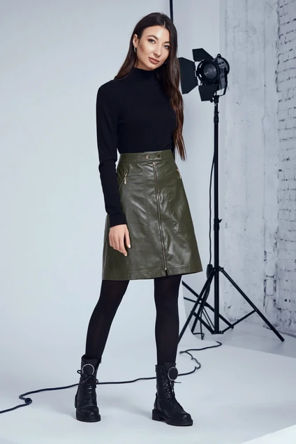 Стильная юбка длины mini из эко кожи. Силуэт трапеция, застежка спереди на разъемную металлическую тесьму-молнию и две кнопки на поясе. Спереди по бокам прорезные наклонные карманы с металлическими молниями и двойной отделочной строчкой. Юбка на отлетной подкладке.