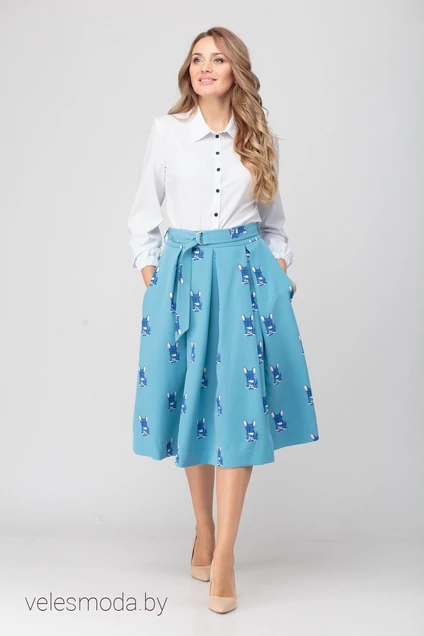 Юбка на притачном поясе. Перед юбки с тремя встречными складками, задняя часть юбки со средним швом и тремя встречными складками, в среднем шве скрытая молния, на поясе две пуговицы. В боковых швах глубокие карманы.