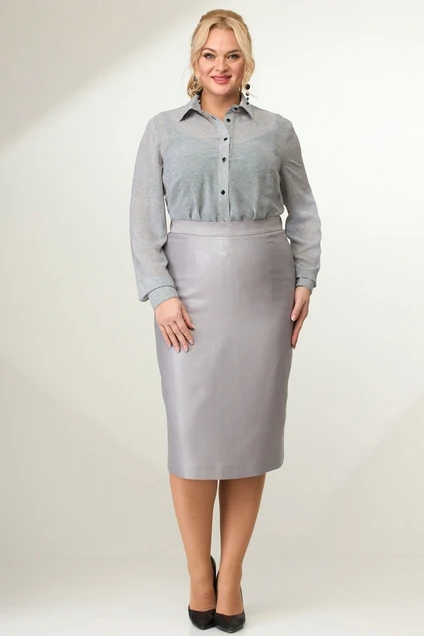 Юбка прямая, немного зауженная книзу, длиной ниже колена, на подкладке. Верх на притачном поясе со шлевками и вставками эластичной тесьмы по спинке. Застежка на молнию в среднем шве. На переднем полотнище вытачки, на заднем - вытачки и шлица в среднем шве.