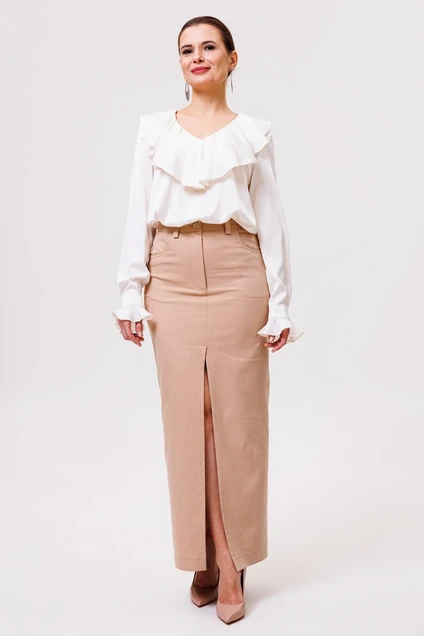 Юбка умеренного объема, прилегающего силуэта.  На переднем полотнище карманы с отрезным бочком, средний шов с обработанной застёжкой-гульфик и разрезом в нижней части шва. На заднем  полотнище, притачные кокетки, средний шов и накладные карманы. Пояс отрезной, притачной с пришивными шлевками. Пояс расположен на естественной линии талии. Застежка пояса на обметанную петлю и пуговицу. По поясу, шлевкам, кокеткам, карманам, средним швам, линии гульфика, а также разрезу и низу изделия, проложены строчки отделочными нитками. Длина юбки миди 100см.