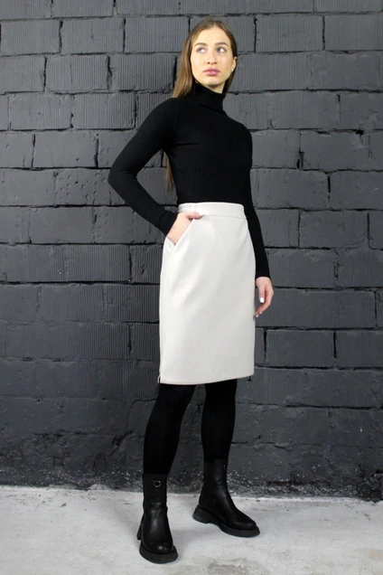 Полушерстяная трикотажная юбка прямого силуэта длиной до колена,с прорезными наклонными карманами по переду. В боковых швах обработаны разрезы по низу которых продета декоративная тесьма на два фиксатора. Спинка со средним швом, пояс спинки на эластичной тесьме.
