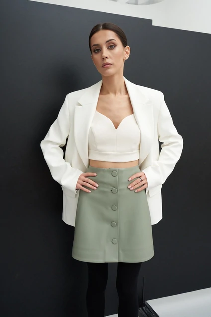 Юбка полуприлегающего силуэта выполнена из экокожи в нежном оливковом цвете