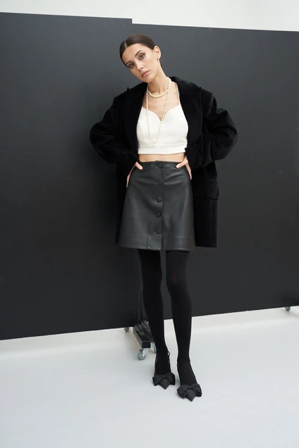 Юбка полуприлегающего силуэта выполнена из экокожи в чёрном цвете