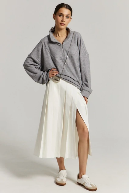 Юбка из белого хлопкового материала, который красиво драпируется, создавая аккуратный силуэт. Юбка имеет высокую талию и застежку на молнию по спинке изделия. По одному боку изделия разрез для удобства и стиля всей юбки. Длина миди. Модель будет отлично сочетаться как с обувью на плоской подошве, так и с туфлями на каблуке, делая её универсальным элементом гардероба.