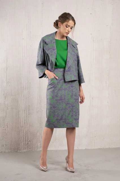 Юбка прямая. Ткань костюмно-плательная средней плотности, приятная на ощупь. Застежка на молнию в боковом шве. На переде шлица и карман. Внутренние швы окантованы. Длина 69 см.