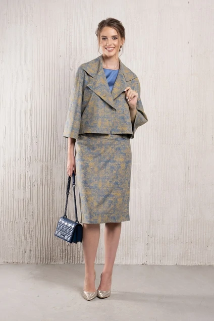 Юбка прямая. Ткань костюмно-плательная средней плотности, приятная на ощупь. Застежка на молнию в боковом шве. На переде шлица и карман. Внутренние швы окантованы. Длина 69 см.