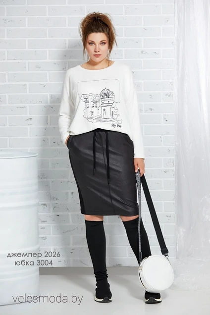 Юбка из высококачественной экокожи на трикотажной основе, с лампасами из флопкового футера, эффектно корректирующими фигуру. Пояс с элластичной тесьмой. На изделии четыре функциональных кармана. Юбка декорирована авторским принтом.